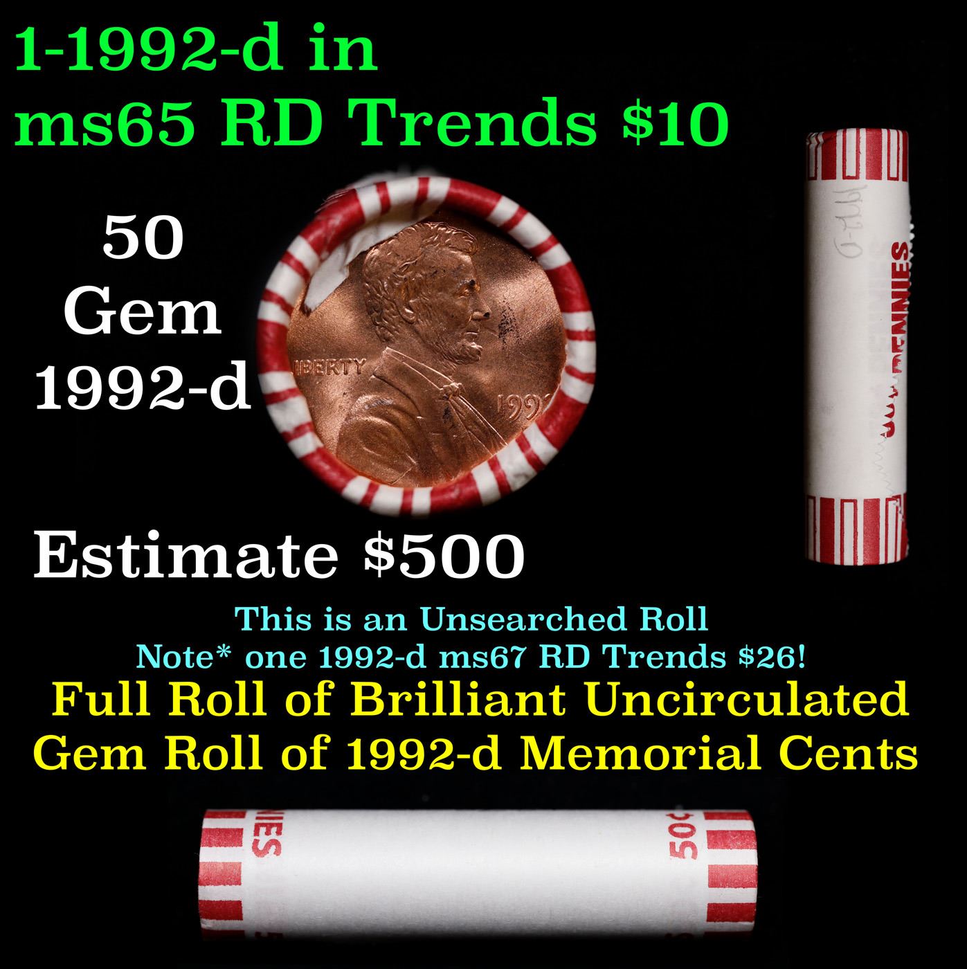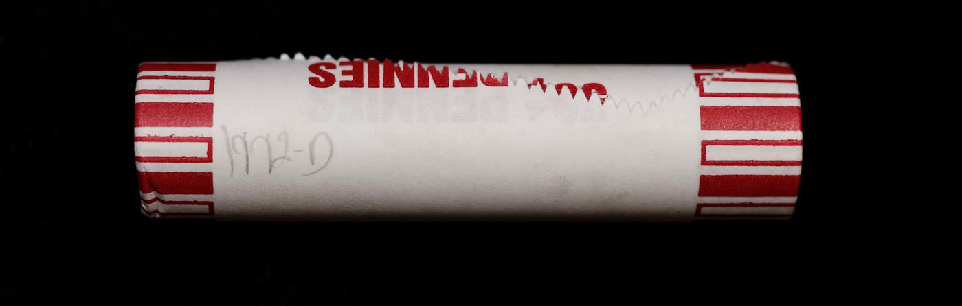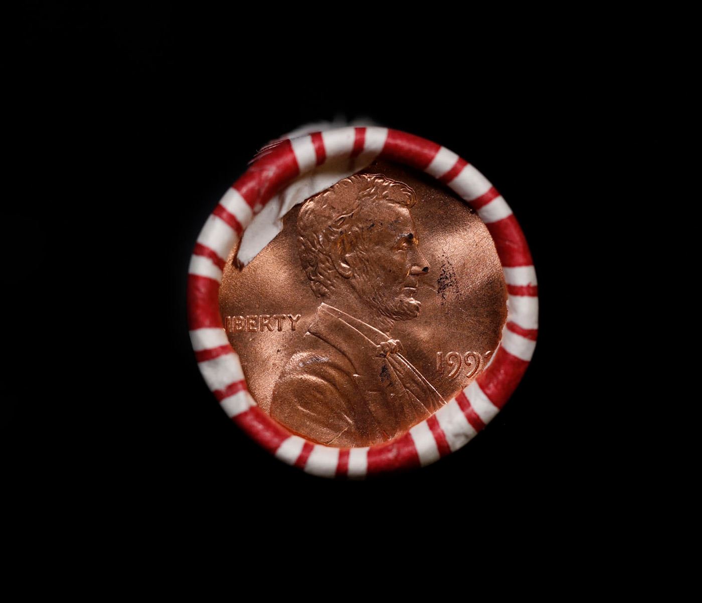Shotgun Lincoln 1c roll, 1992-d 50 pcs Steel-Strong Wrapper.. A terrific Shotgun roll of Lincoln cents. Most if not all coin should be cherry red.