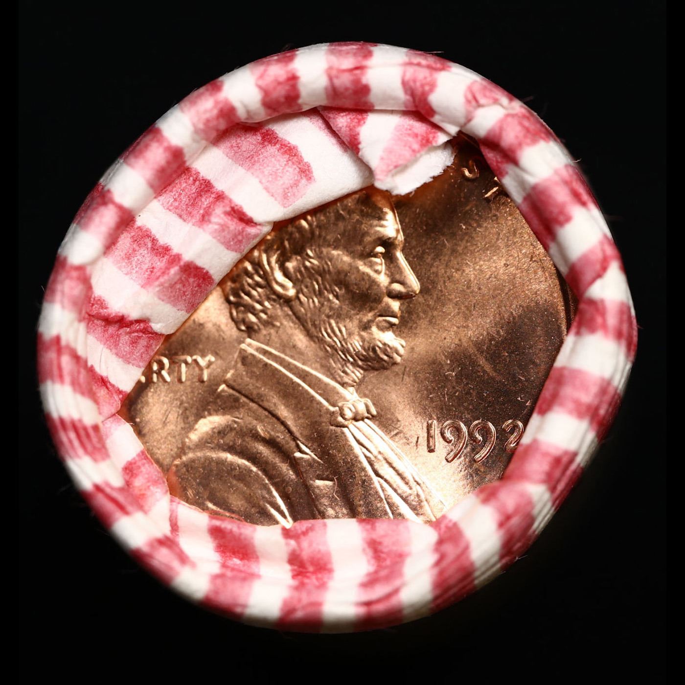 Shotgun Lincoln 1c roll, 1992-p 50 pcs Brandt Wrapper.. A terrific Shotgun roll of Lincoln cents. Most if not all coin should be cherry red.