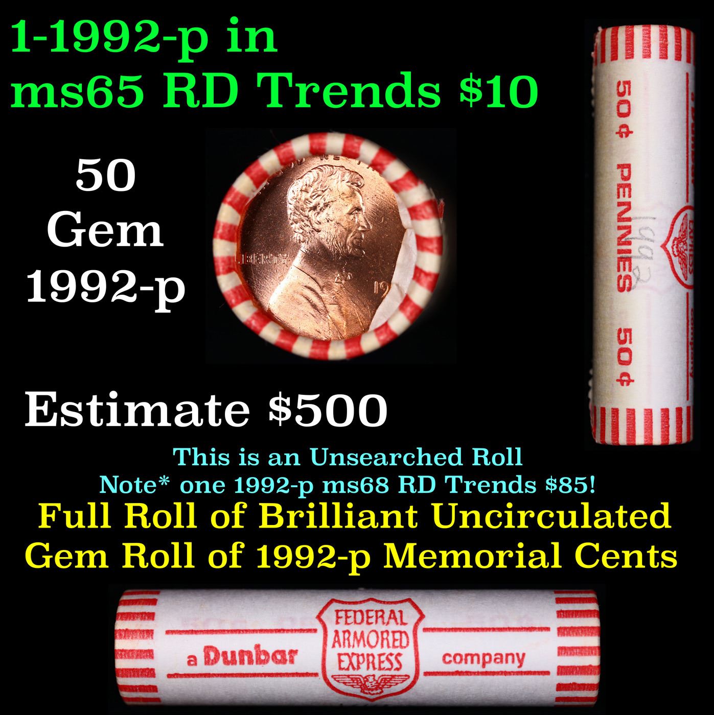 Shotgun Lincoln 1c roll, 1992-p 50 pcs Dunbar Wrapper .