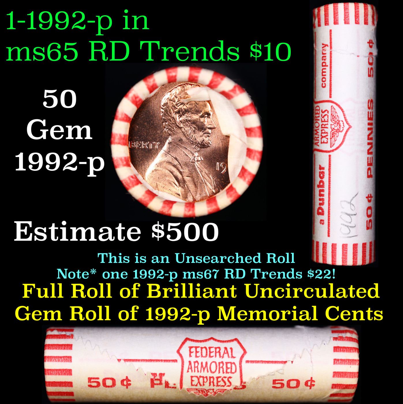 Shotgun Lincoln 1c roll, 1992-p 50 pcs Dunbar Wrapper. A terrific Shotgun roll of Lincoln cents. All coins cherry red. Trends ms65 rd $10