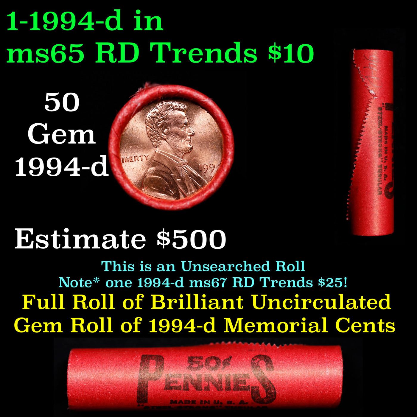 Shotgun Lincoln 1c roll, 1994-d 50 pcs Steel-Strong Wrapper.. A terrific Shotgun roll of Lincoln cents. Most if not all coin should be cherry red.