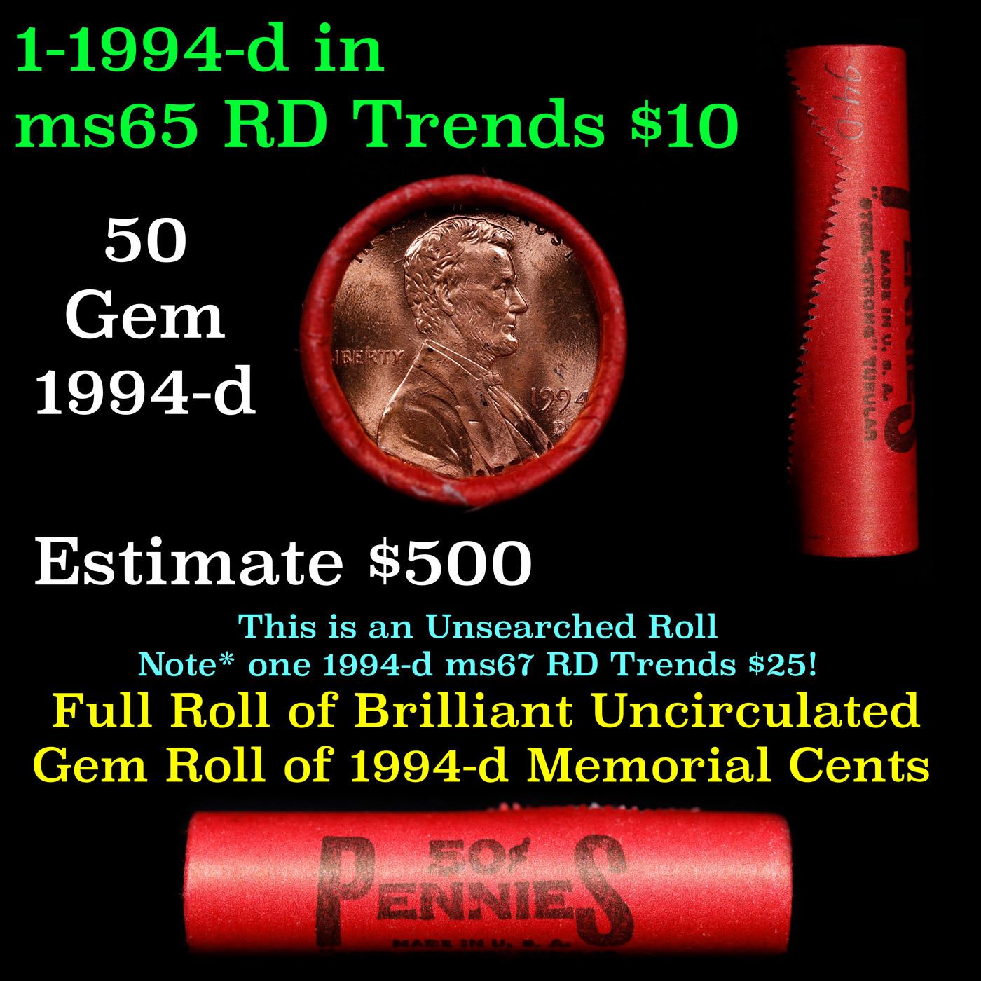 Shotgun Lincoln 1c roll, 1994-d 50 pcs Steel-Strong Wrapper.. A terrific Shotgun roll of Lincoln cents. Most if not all coin should be cherry red.