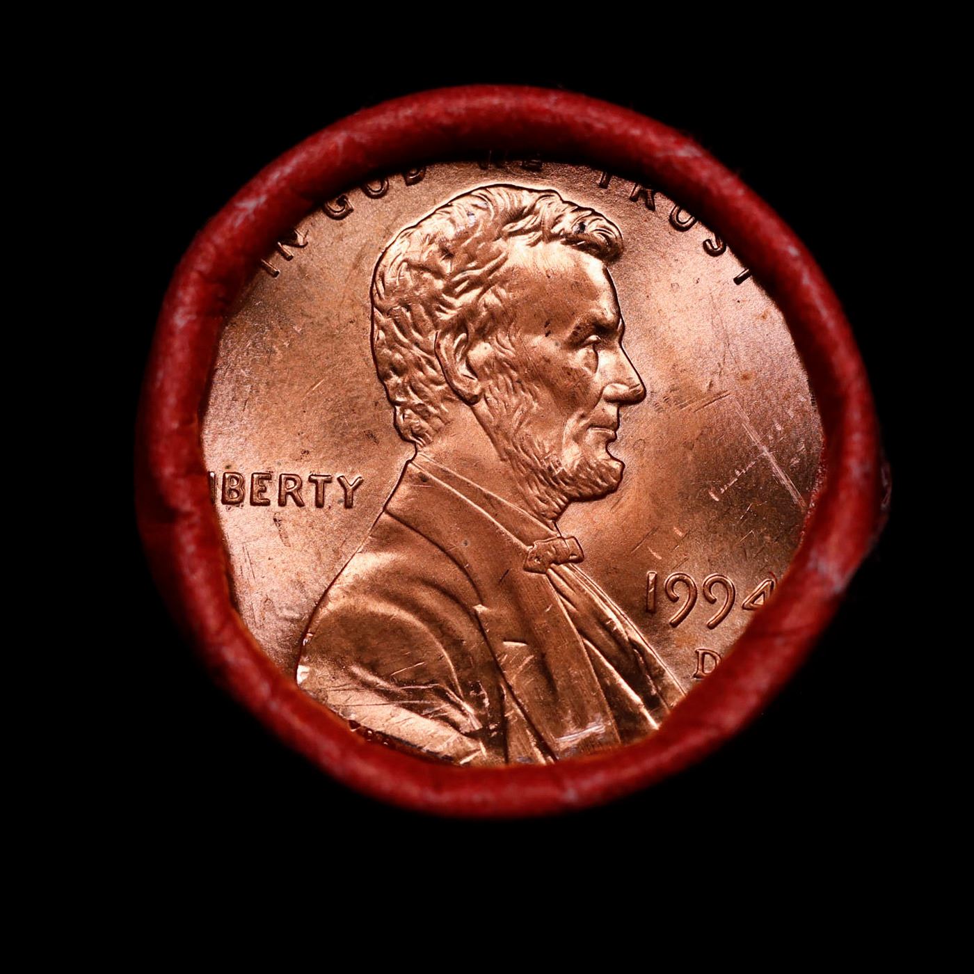 Shotgun Lincoln 1c roll, 1994-d 50 pcs Steel-Strong Wrapper.. A terrific Shotgun roll of Lincoln cents. Most if not all coin should be cherry red.