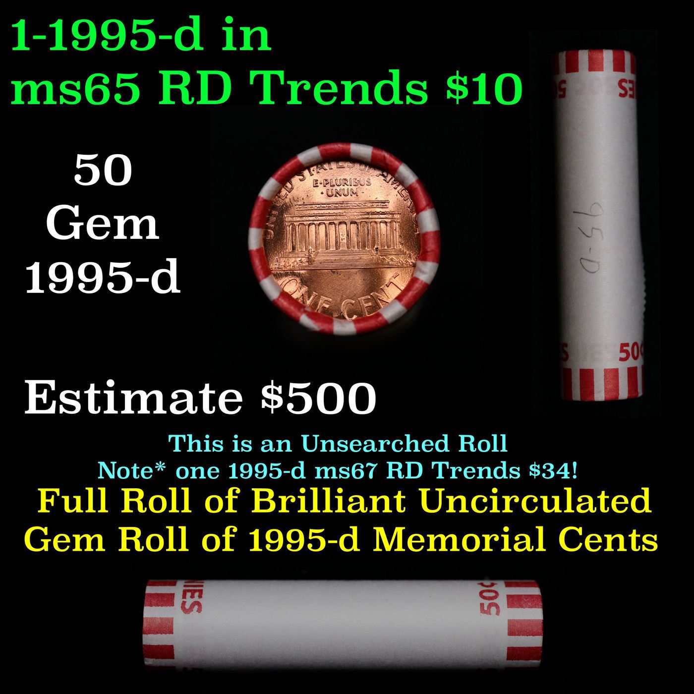 Shotgun Lincoln 1c roll, 1995-d 50 pcs Bank Wrapper.. A terrific Shotgun roll of Lincoln cents. Most if not all coin should be cherry red.
