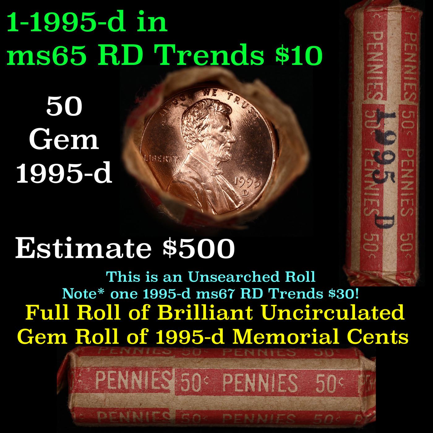 Shotgun Lincoln 1c roll, 1995-d 50 pcs Dunbar Wrapper .