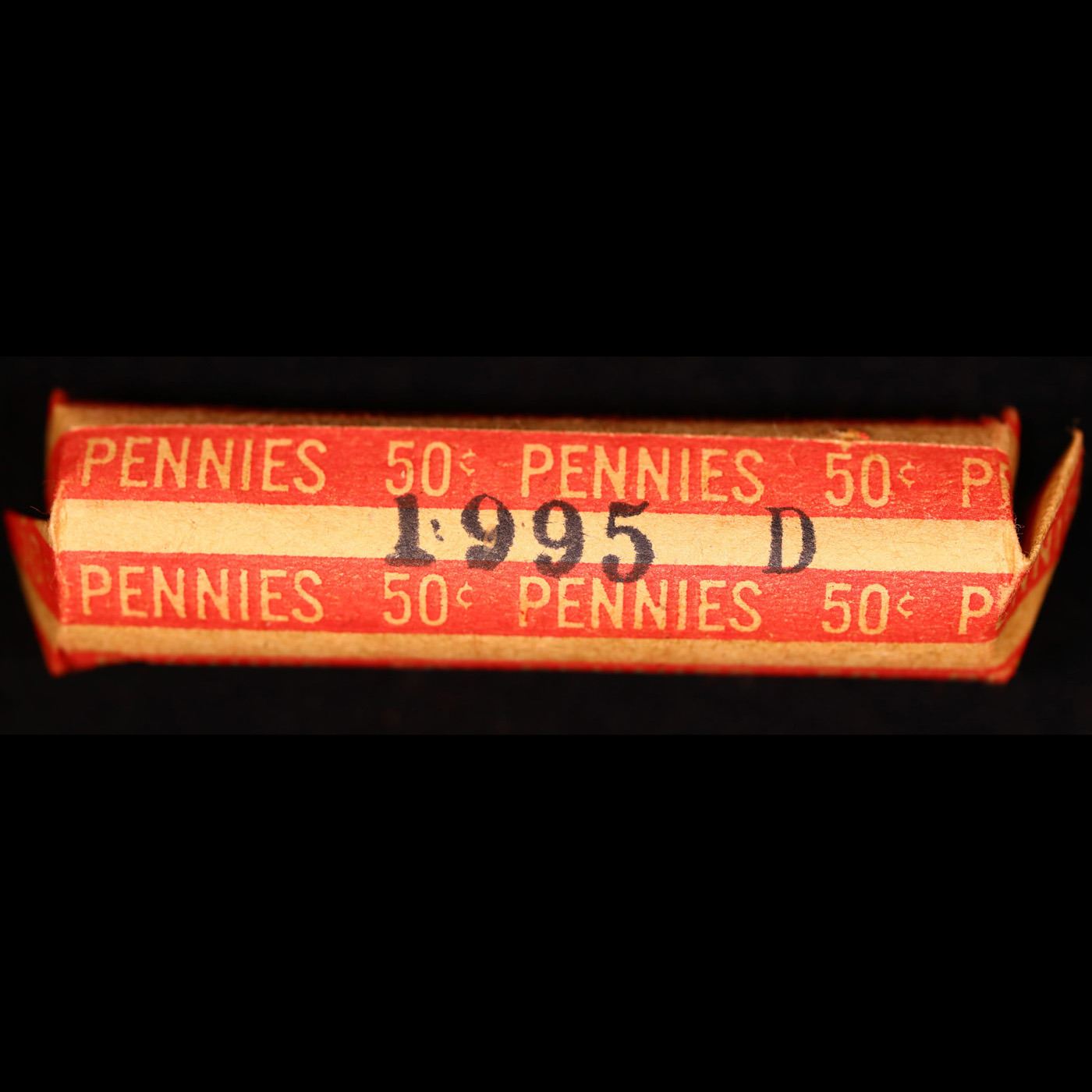 Shotgun Lincoln 1c roll, 1995-d 50 pcs Old Bank Style Wrapper. A terrific Shotgun roll of Lincoln cents. All coins cherry red. Trends ms65 rd $16