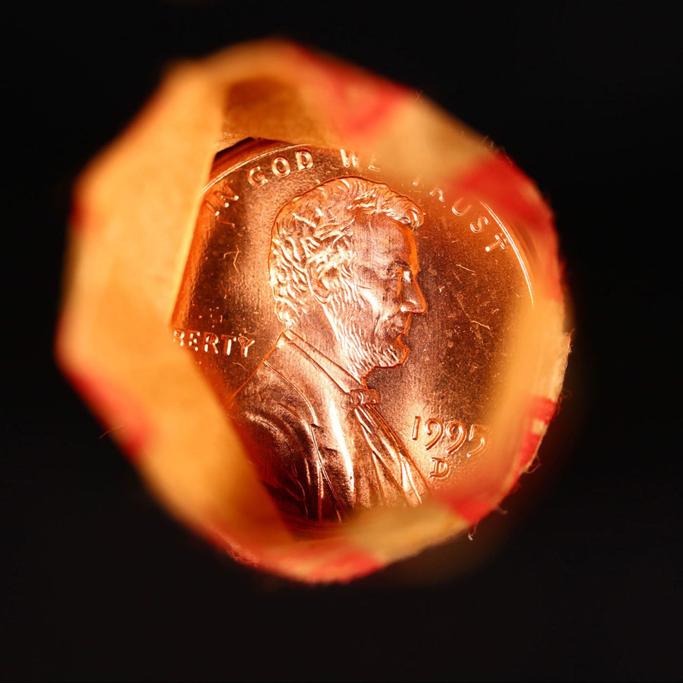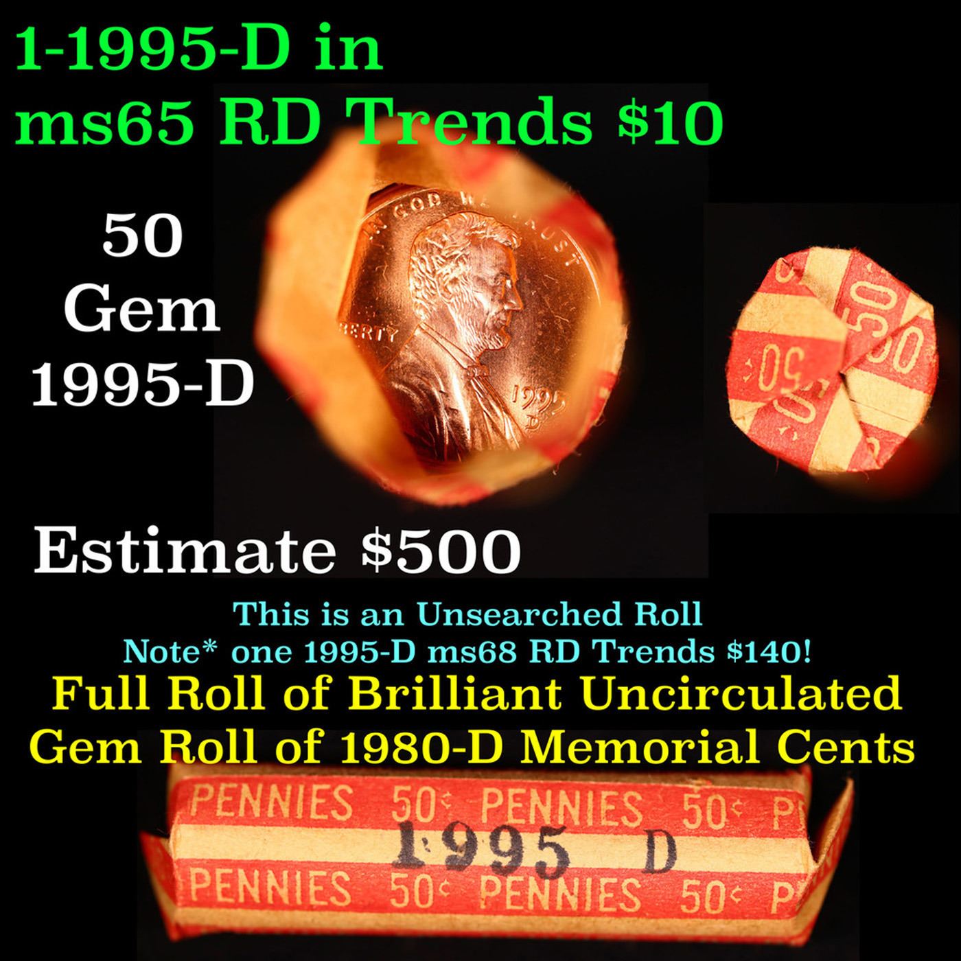 Shotgun Lincoln 1c roll, 1995-d 50 pcs Old Bank Style Wrapper. A terrific Shotgun roll of Lincoln cents. All coins cherry red. Trends ms65 rd $16