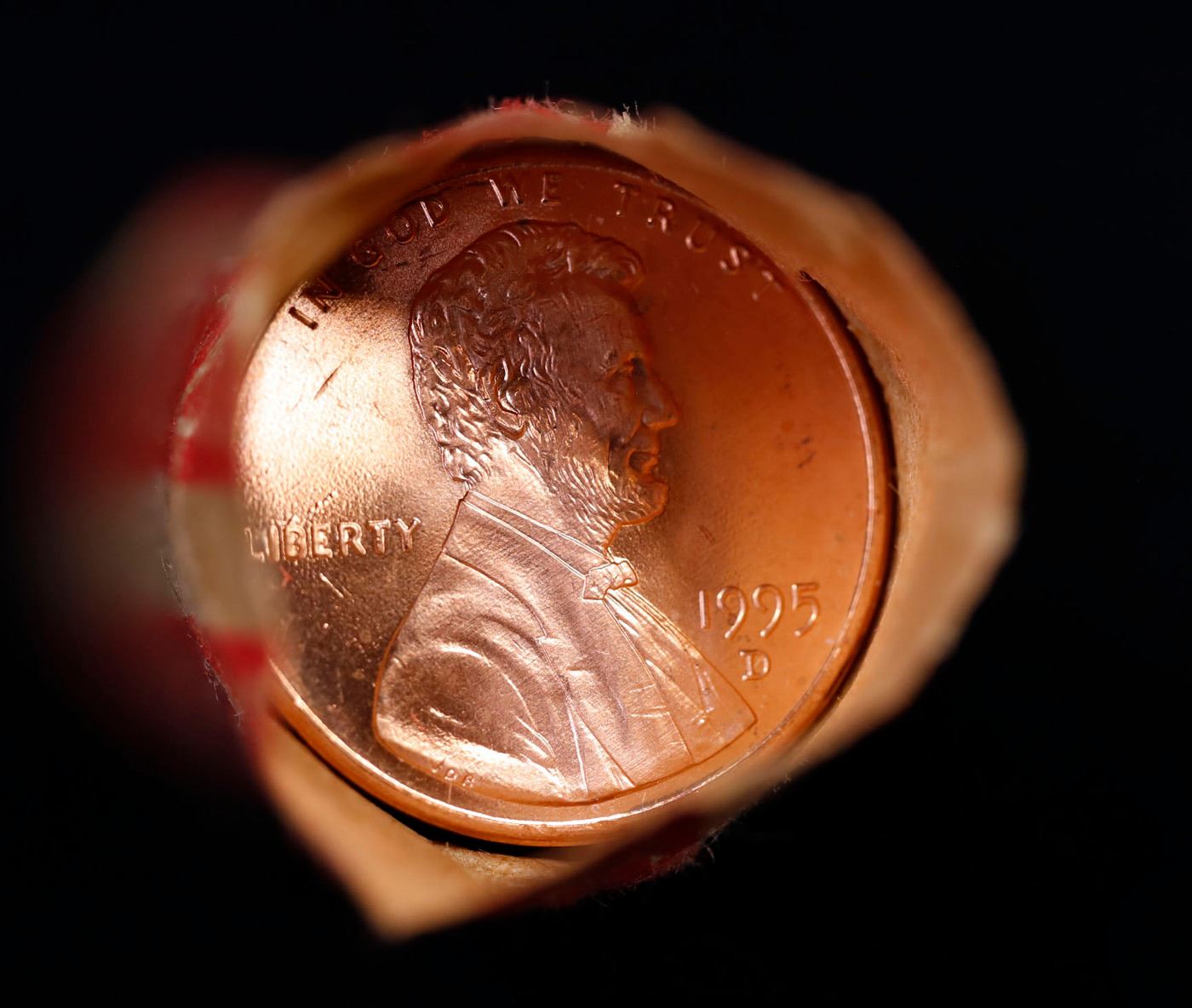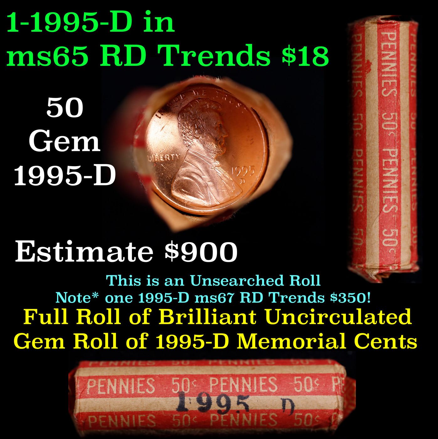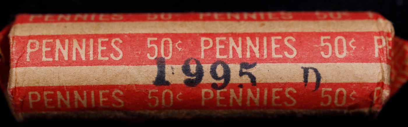 Shotgun Lincoln 1c roll, 1995-d 50 pcs Wrapper . A terrific Shotgun roll of Lincoln cents. All coins appear to be cherry red. Trends ms65 rd $10