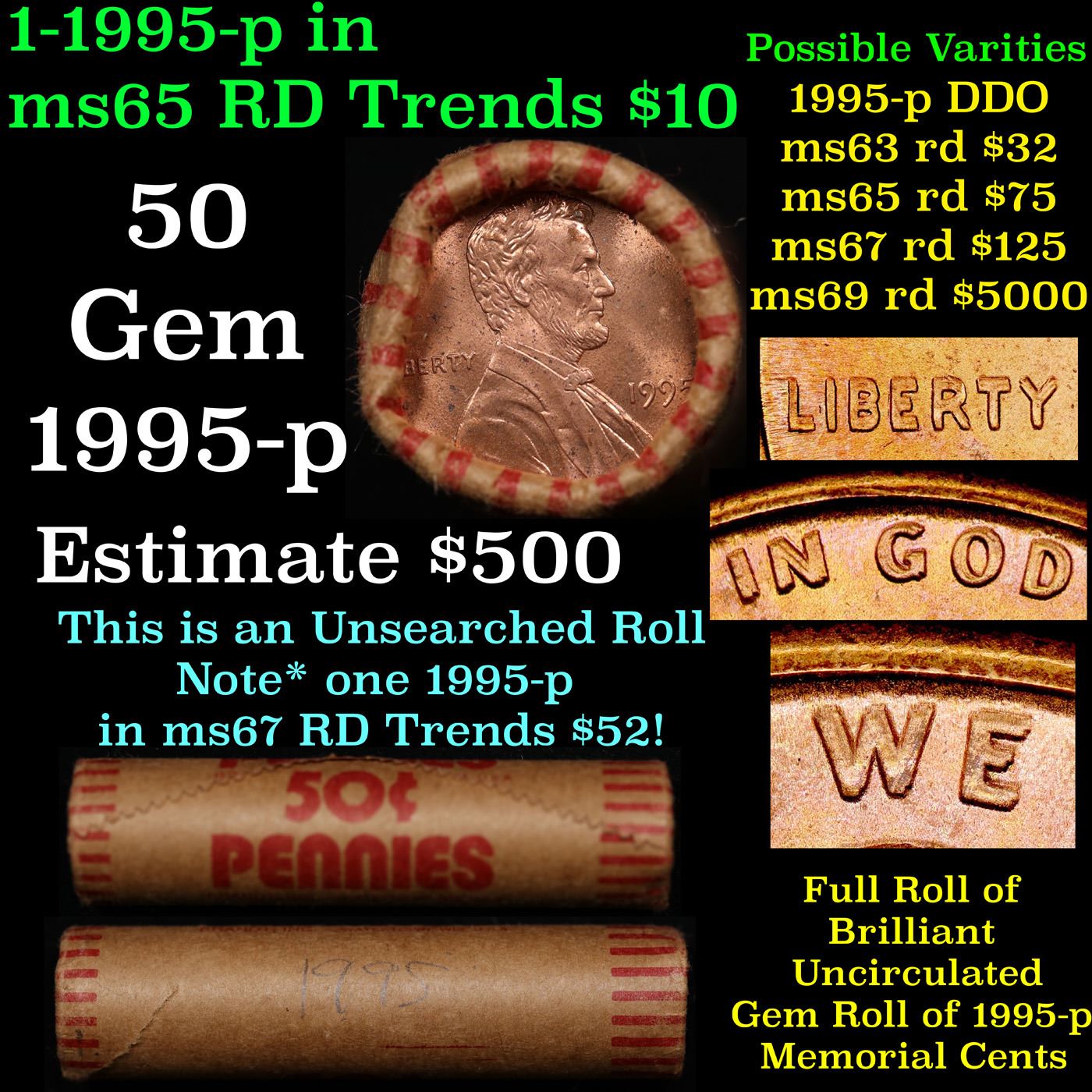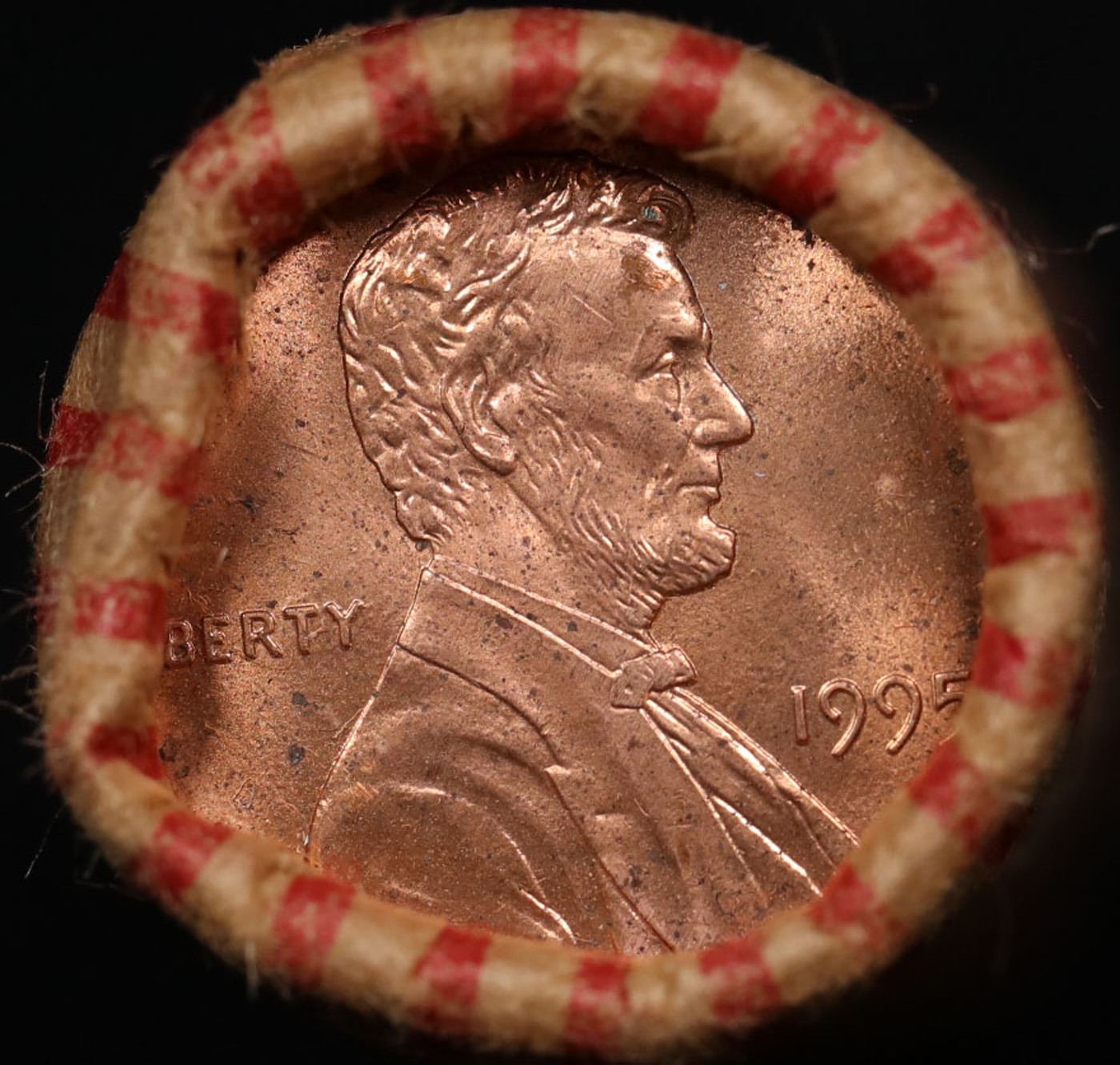 Shotgun Lincoln 1c roll, 1995-p 50 pcs Bank Wrapper.. A terrific Shotgun roll of Lincoln cents. Most if not all coin should be cherry red.