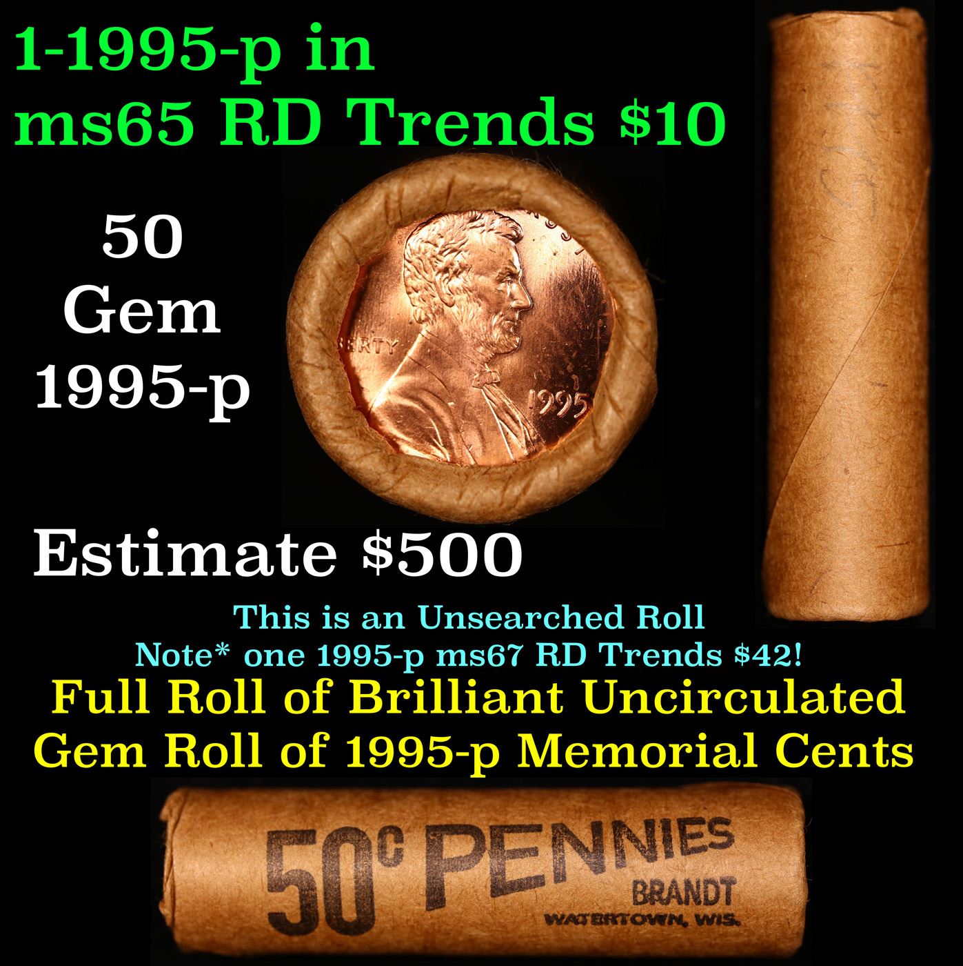 Shotgun Lincoln 1c roll, 1995-p 50 pcs Brandt Wrapper . A terrific Shotgun roll of Lincoln cents. All coins cherry red. Trends ms65 rd $18