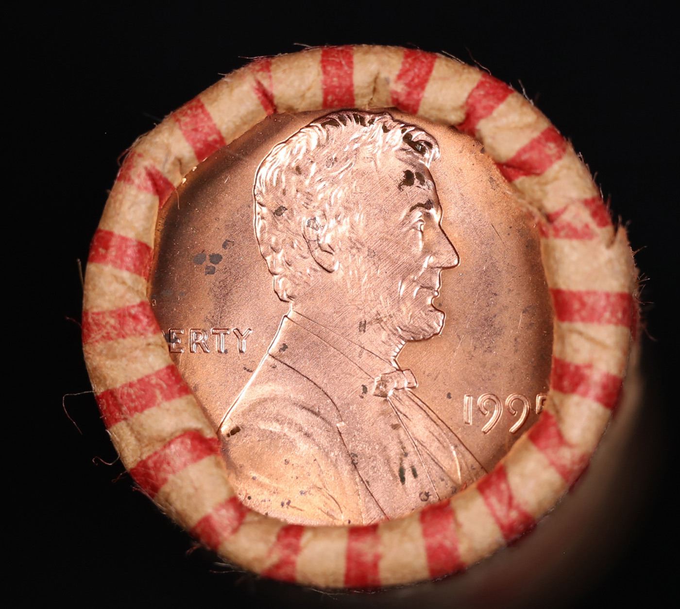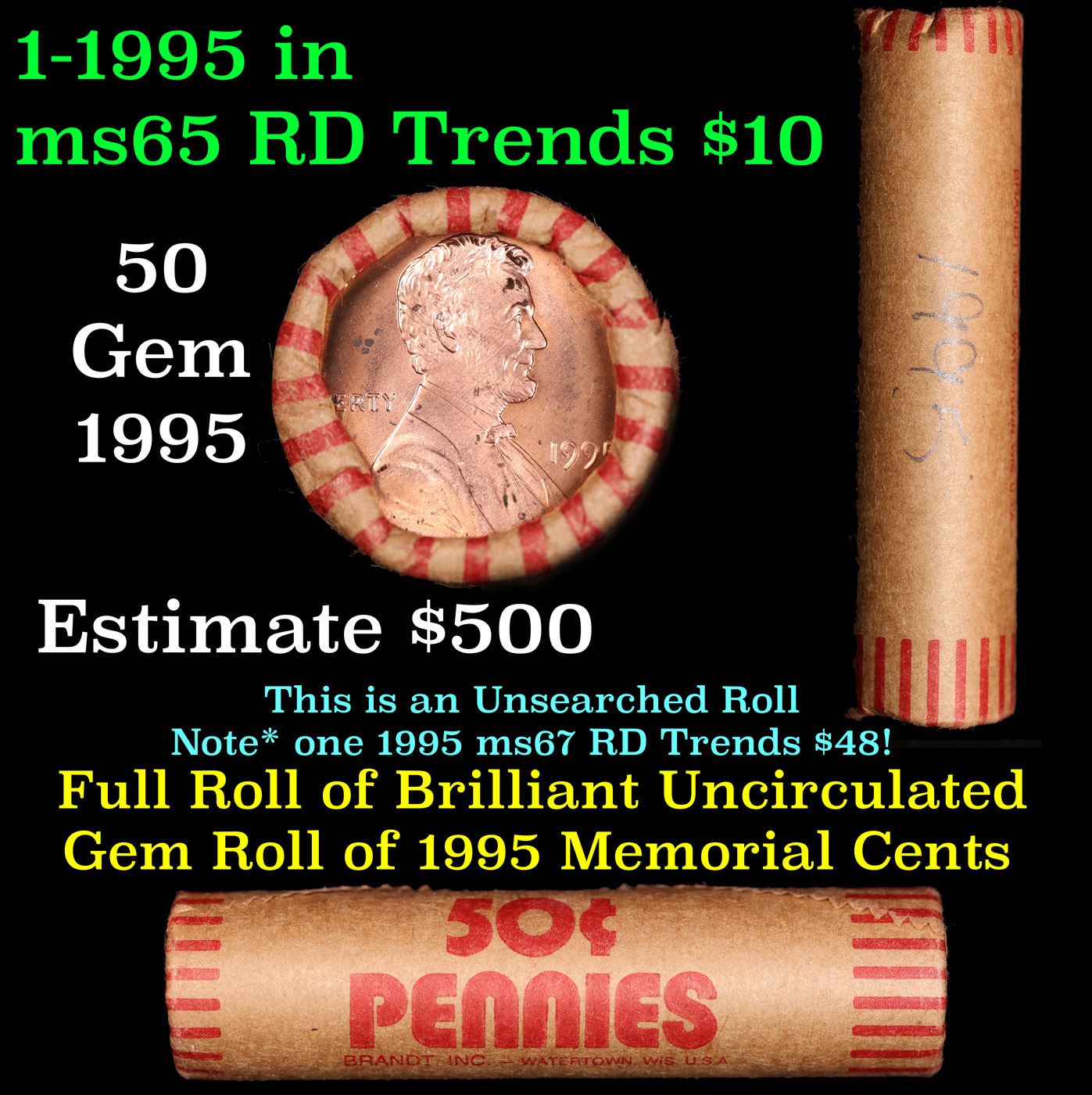 Shotgun Lincoln 1c roll, 1995-p 50 pcs Brandt Wrapper . A terrific Shotgun roll of Lincoln cents. All coins cherry red. There are potential for one or more of these coins to be the special 1995-p Double Die Obverse which trends $80 at ms65 rd intead of the normal $12 at ms65 rd.