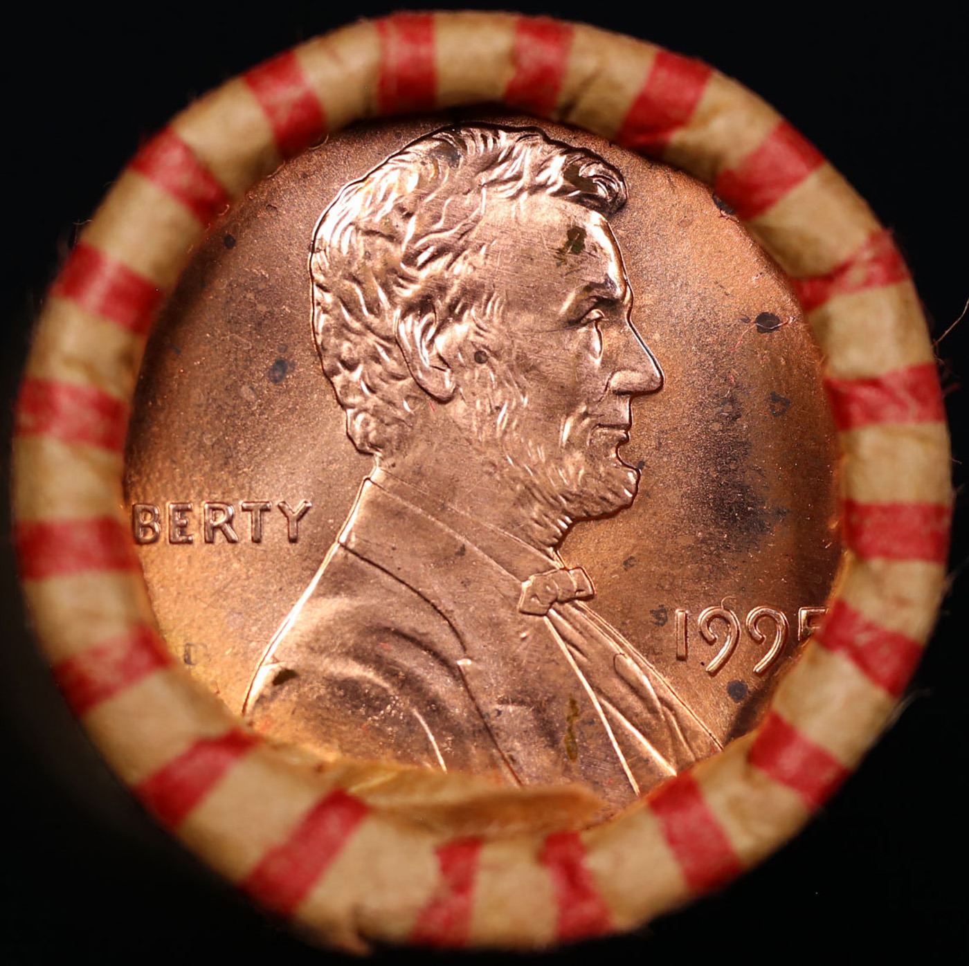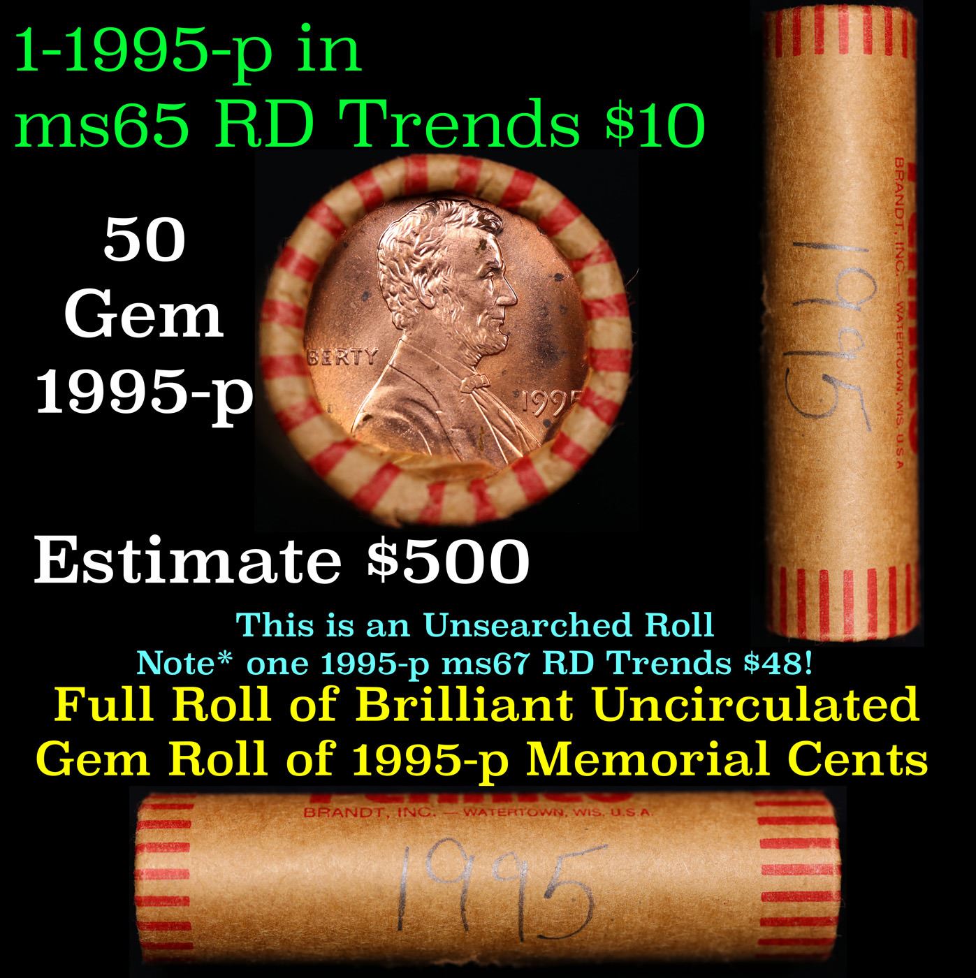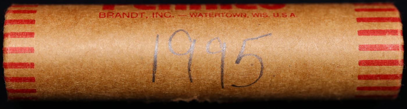 Shotgun Lincoln 1c roll, 1995-p 50 pcs Brandt Wrapper . A terrific Shotgun roll of Lincoln cents. All coins cherry red. There are potential for one or more of these coins to be the special 1995-p Double Die Obverse which trends $80 at ms65 rd intead of the normal $12 at ms65 rd.