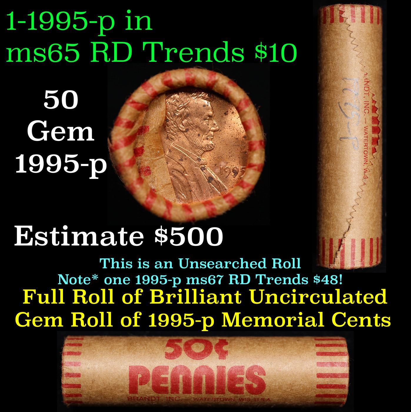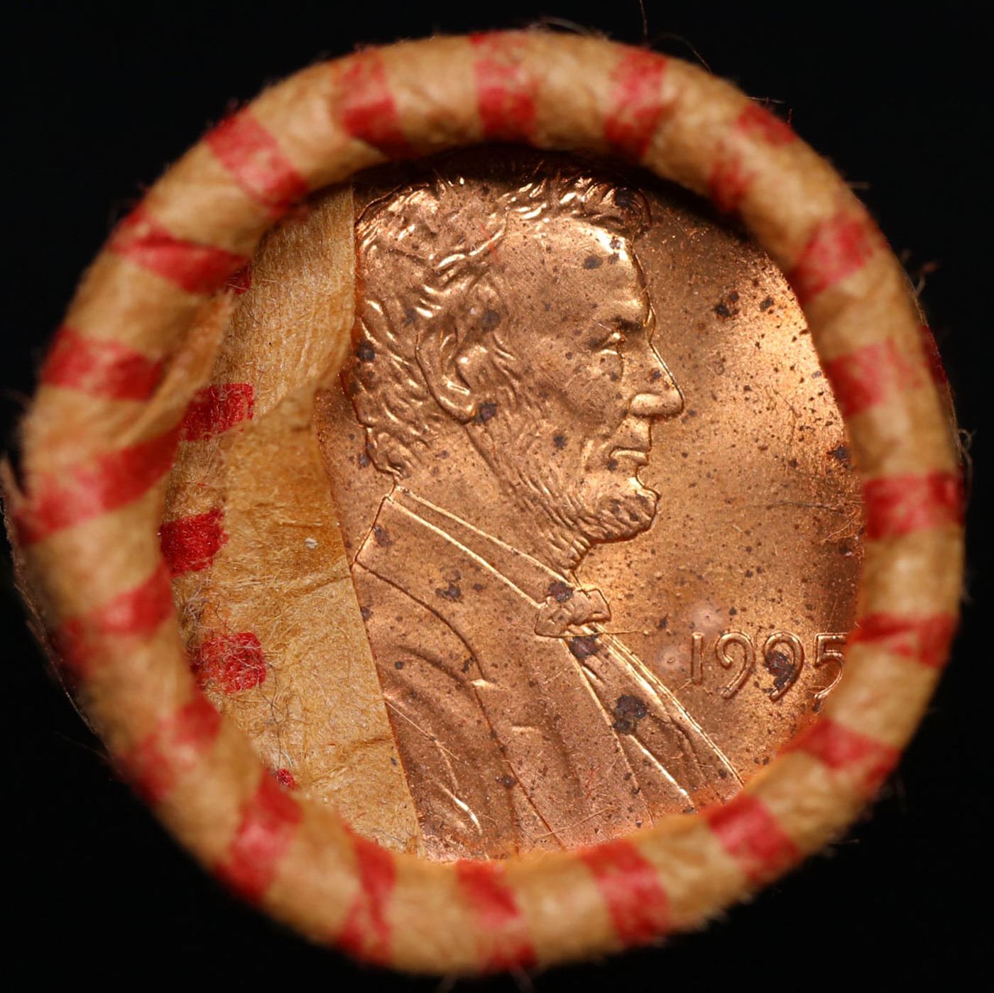 Shotgun Lincoln 1c roll, 1995-p 50 pcs Brandt Wrapper . A terrific Shotgun roll of Lincoln cents. All coins cherry red. There are potential for one or more of these coins to be the special 1995-p Double Die Obverse which trends $80 at ms65 rd intead of the normal $12 at ms65 rd.