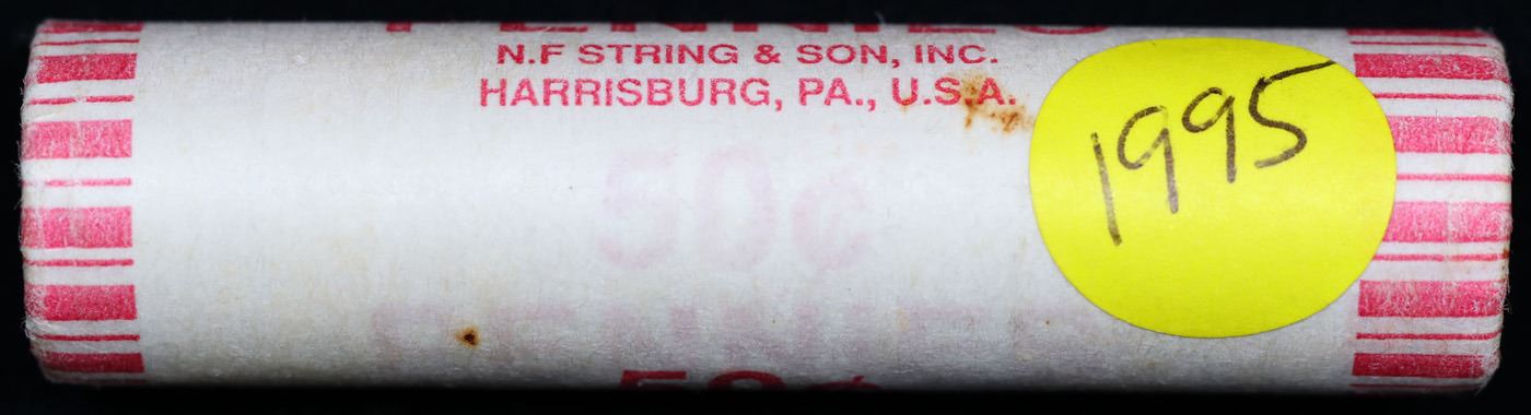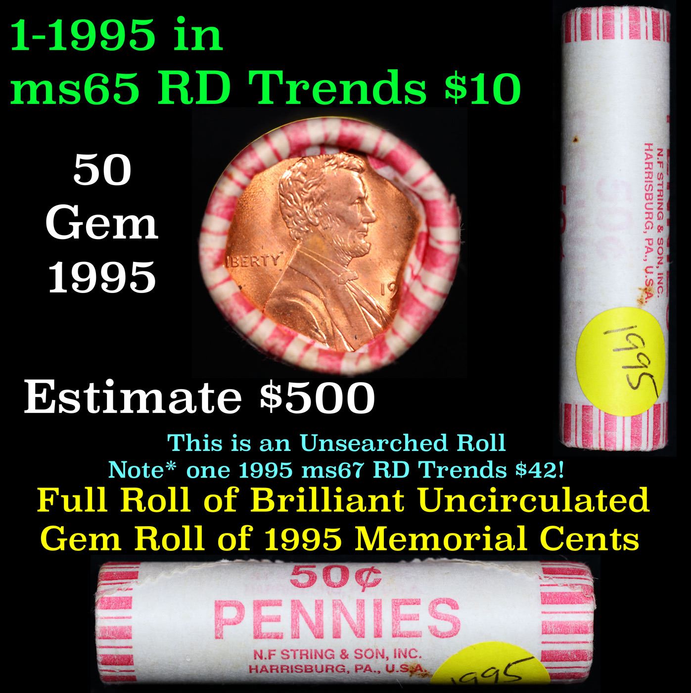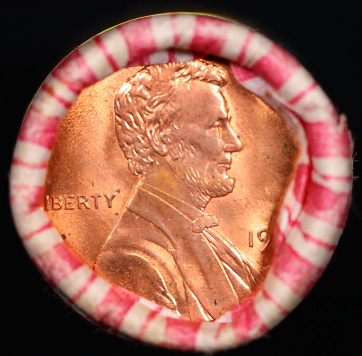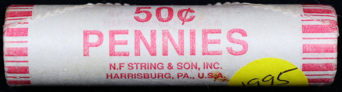 Shotgun Lincoln 1c roll, 1995-p 50 pcs N.F String & Son Wrapper . A terrific Shotgun roll of Lincoln cents. All coins cherry red. Trends ms65 rd $10