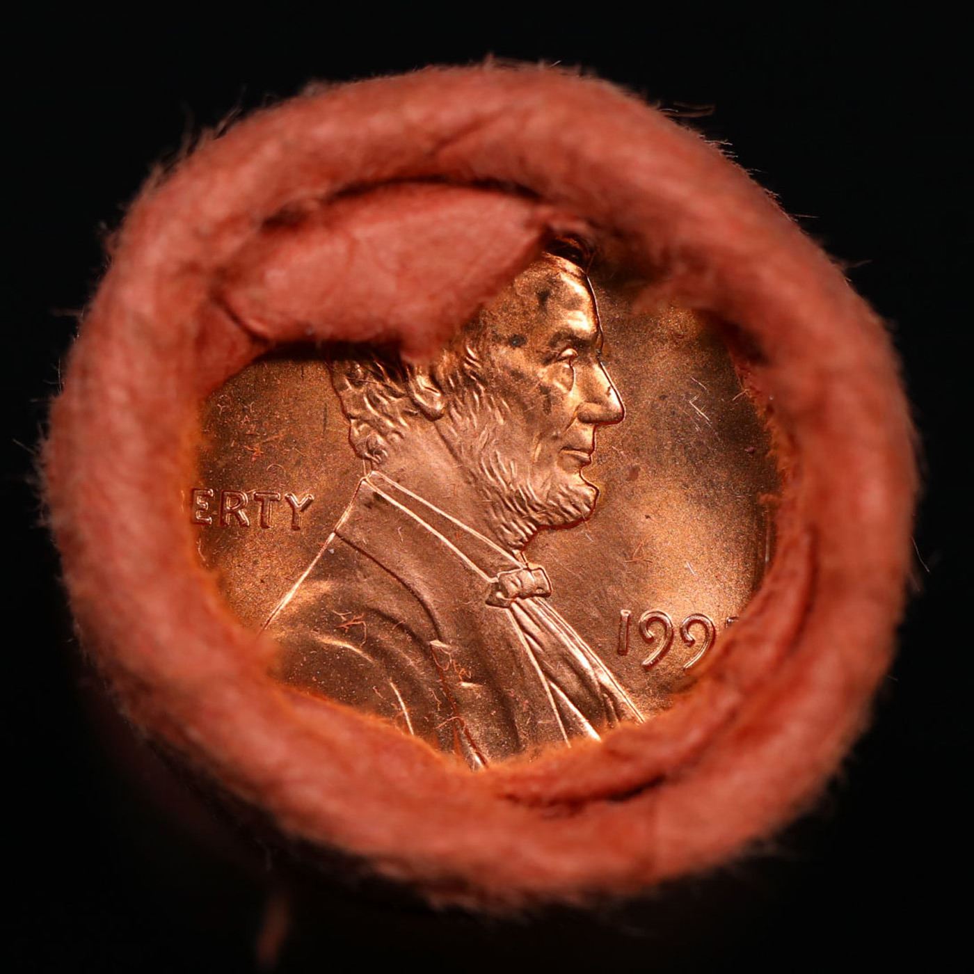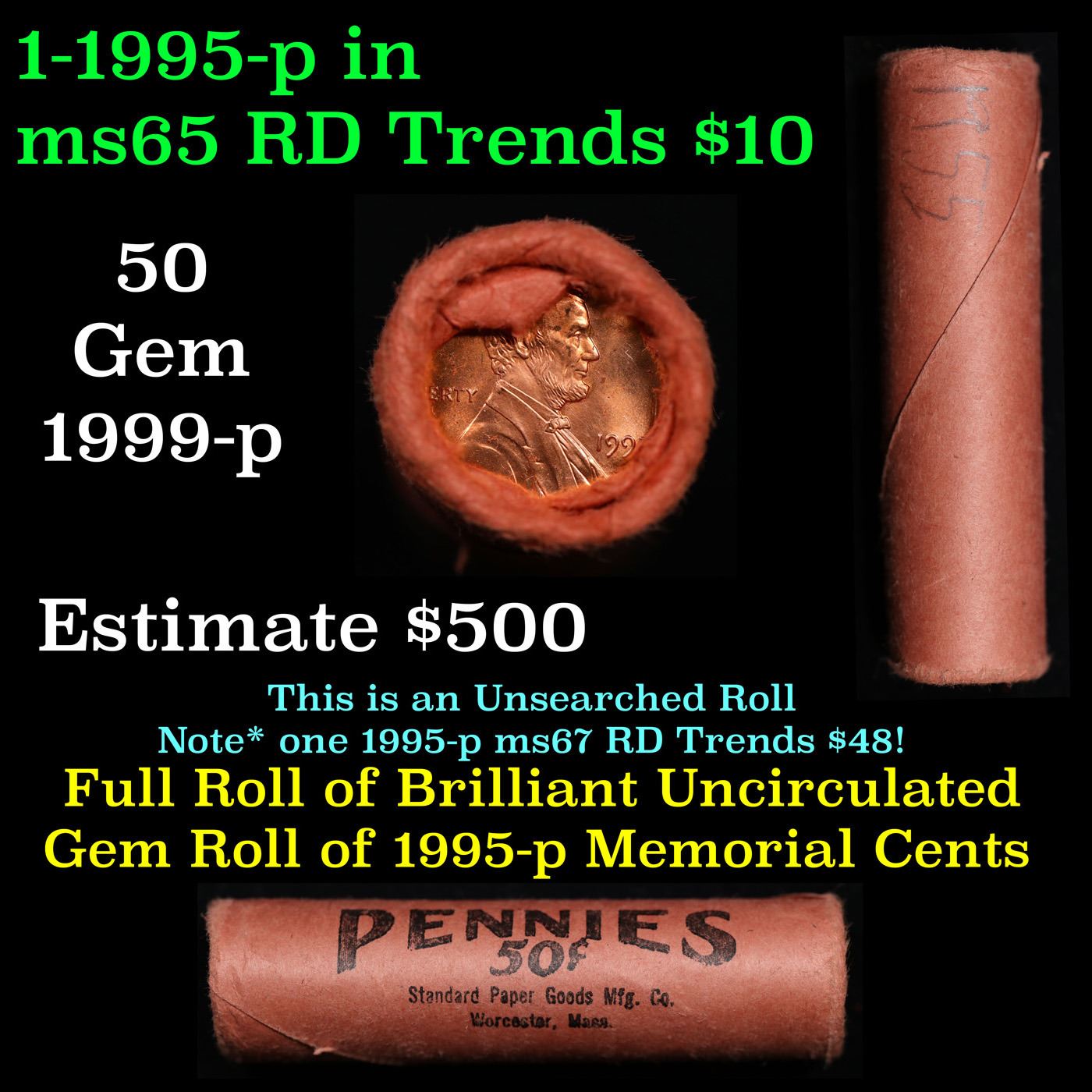 Shotgun Lincoln 1c roll, 1995-p 50 pcs Standard Paper Good Mig. Co. Wrapper.. A terrific Shotgun roll of Lincoln cents. All coins appear to be cherry red. There are potential for one or more of these coins to be the special 1995-p Double Die Obverse which trends $80 at ms65 rd intead of the normal $12 at ms65 rd.