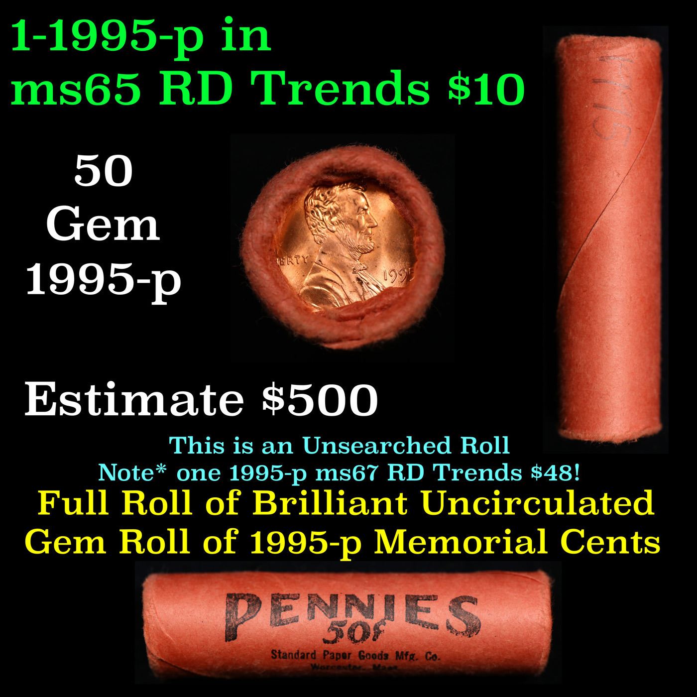 Shotgun Lincoln 1c roll, 1995-p 50 pcs Standard Paper Good Mig. Co. Wrapper.. A terrific Shotgun roll of Lincoln cents. All coins appear to be cherry red. There are potential for one or more of these coins to be the special 1995-p Double Die Obverse which trends $80 at ms65 rd intead of the normal $12 at ms65 rd.