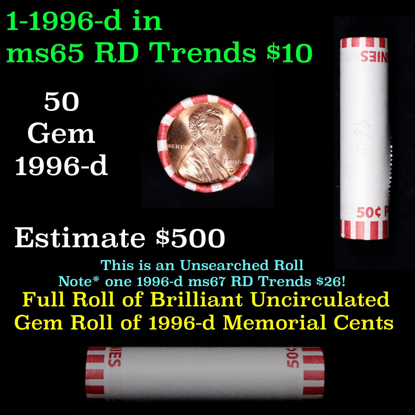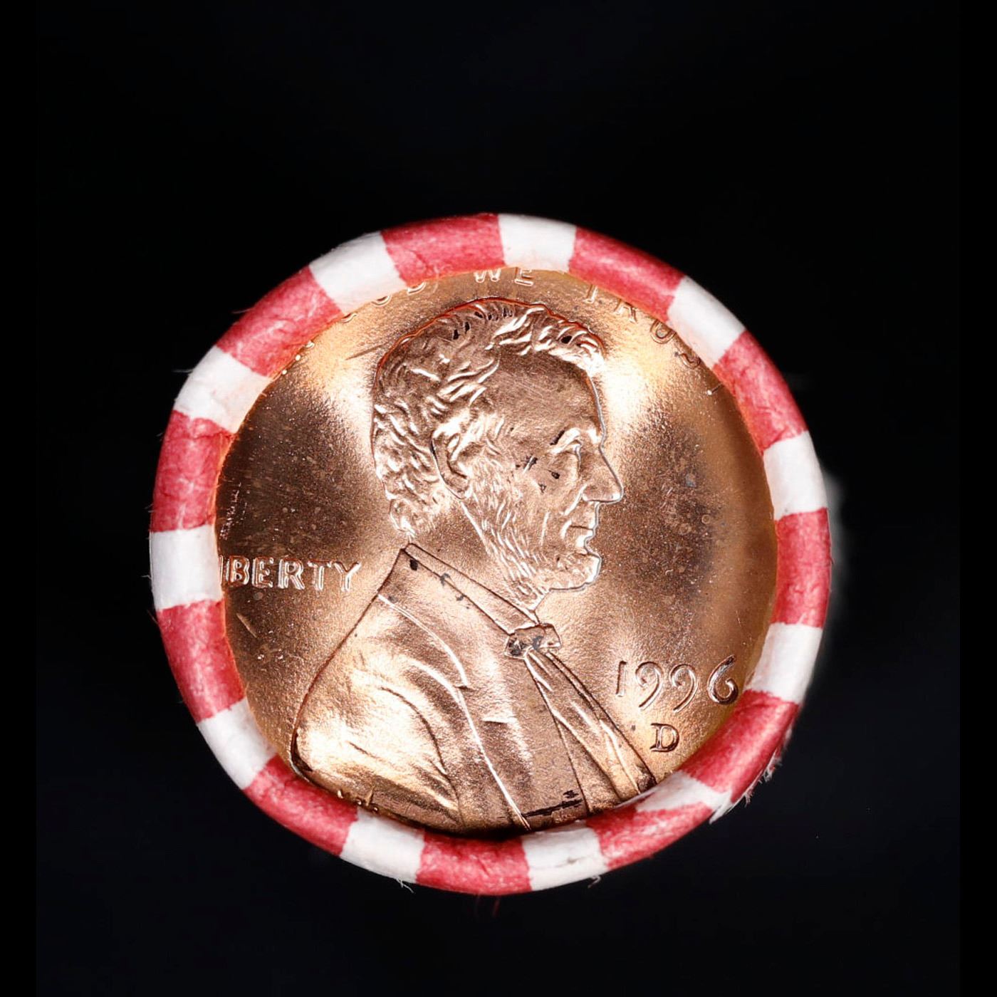 Shotgun Lincoln 1c roll, 1996-d 50 pcs Bank Wrapper.. A terrific Shotgun roll of Lincoln cents. Most if not all coin should be cherry red.