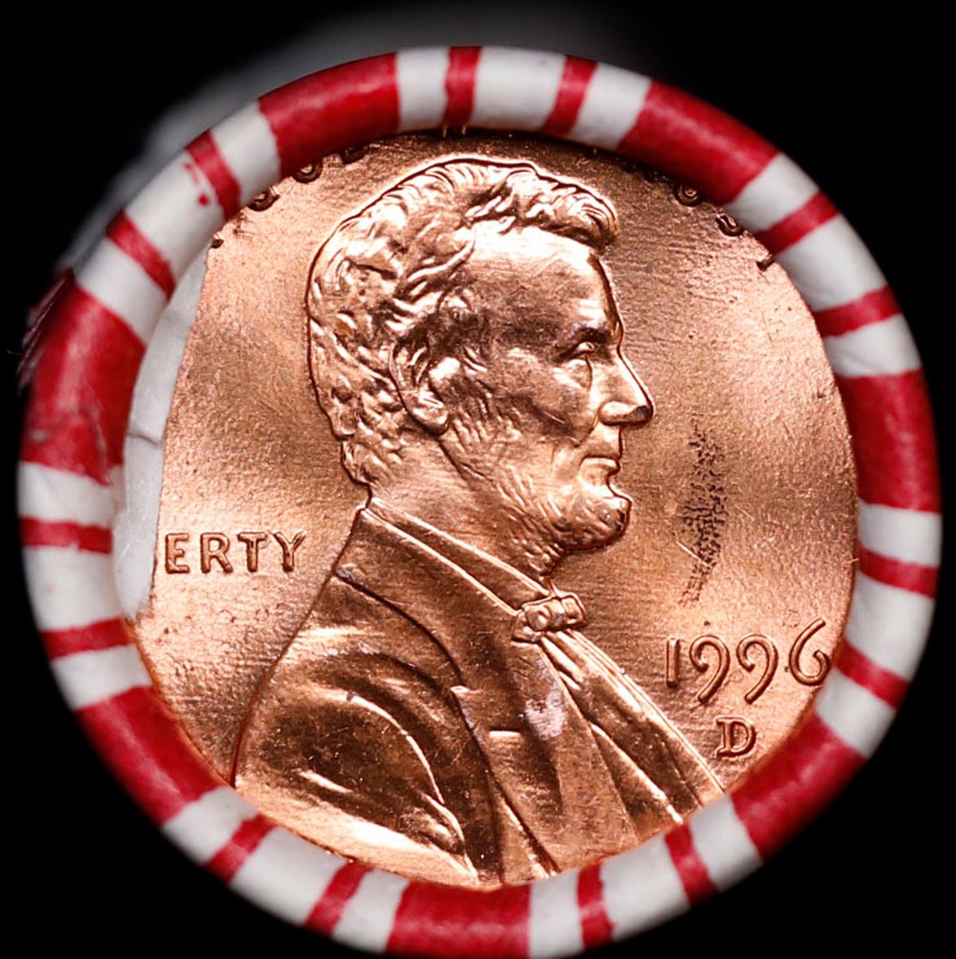 Shotgun Lincoln 1c roll, 1996-d 50 pcs Bank Wrapper.. A terrific Shotgun roll of Lincoln cents. Most if not all coin should be cherry red.