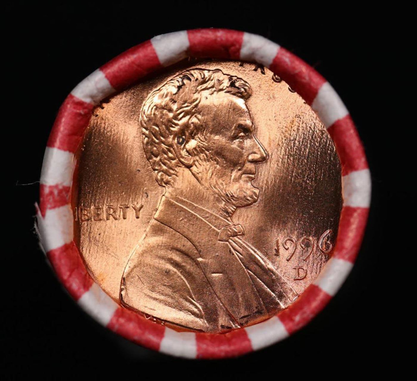 Shotgun Lincoln 1c roll, 1996-d 50 pcs Bank Wrapper.. A terrific Shotgun roll of Lincoln cents. Most if not all coin should be cherry red.