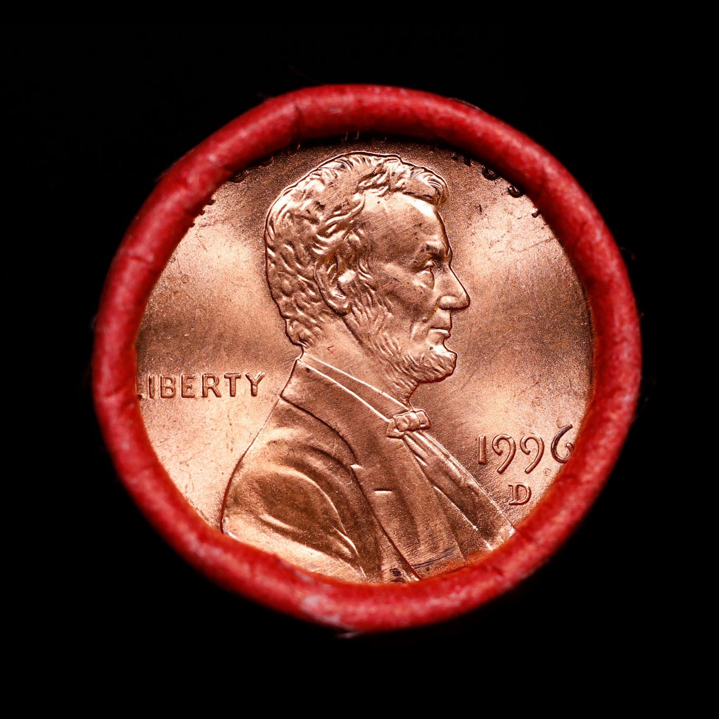 Shotgun Lincoln 1c roll, 1996-d 50 pcs Steel-Strong Wrapper.. A terrific Shotgun roll of Lincoln cents. Most if not all coin should be cherry red.