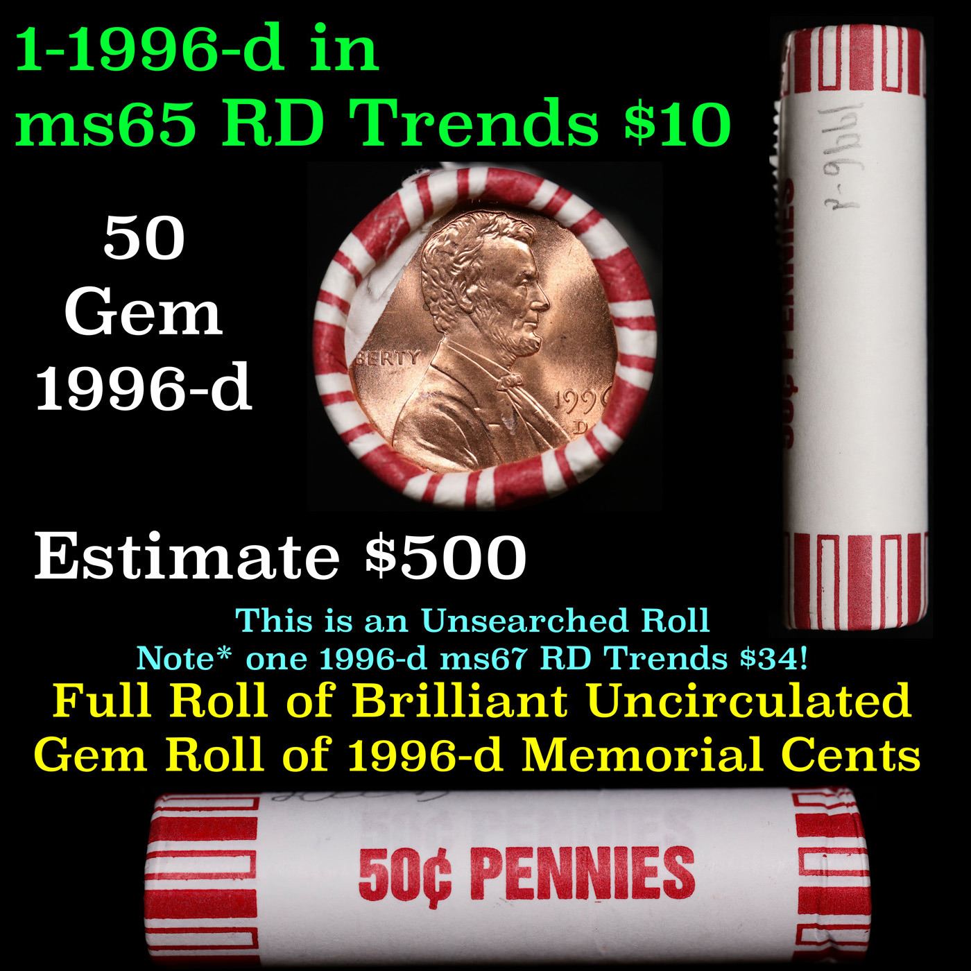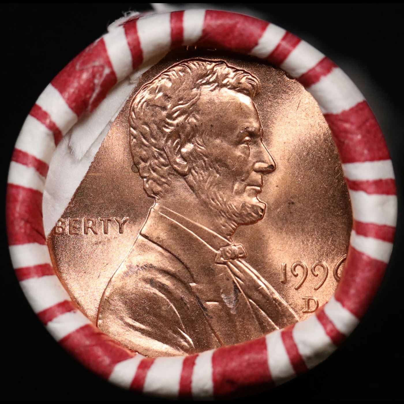 Shotgun Lincoln 1c roll, 1996-d 50 pcs Steel Strong Wrapper.. A terrific Shotgun roll of Lincoln cents. Most if not all coin should be cherry red.