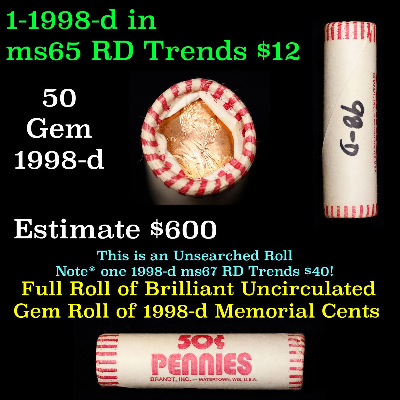 Shotgun Lincoln 1c roll, 1998-d 50 pcs Brandt Wrapper.. A terrific Shotgun roll of Lincoln cents. Most if not all coin should be cherry red.