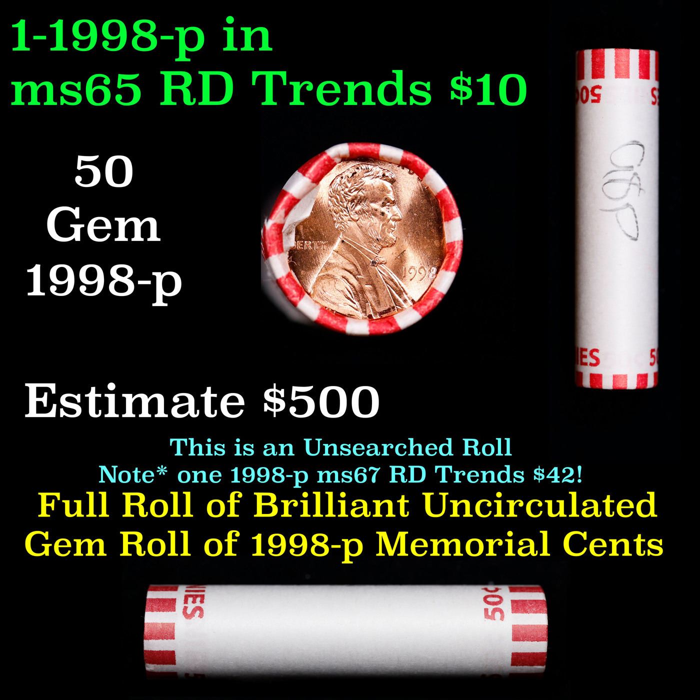 Shotgun Lincoln 1c roll, 1998-p 50 pcs Bank Wrapper.. A terrific Shotgun roll of Lincoln cents. Most if not all coin should be cherry red.