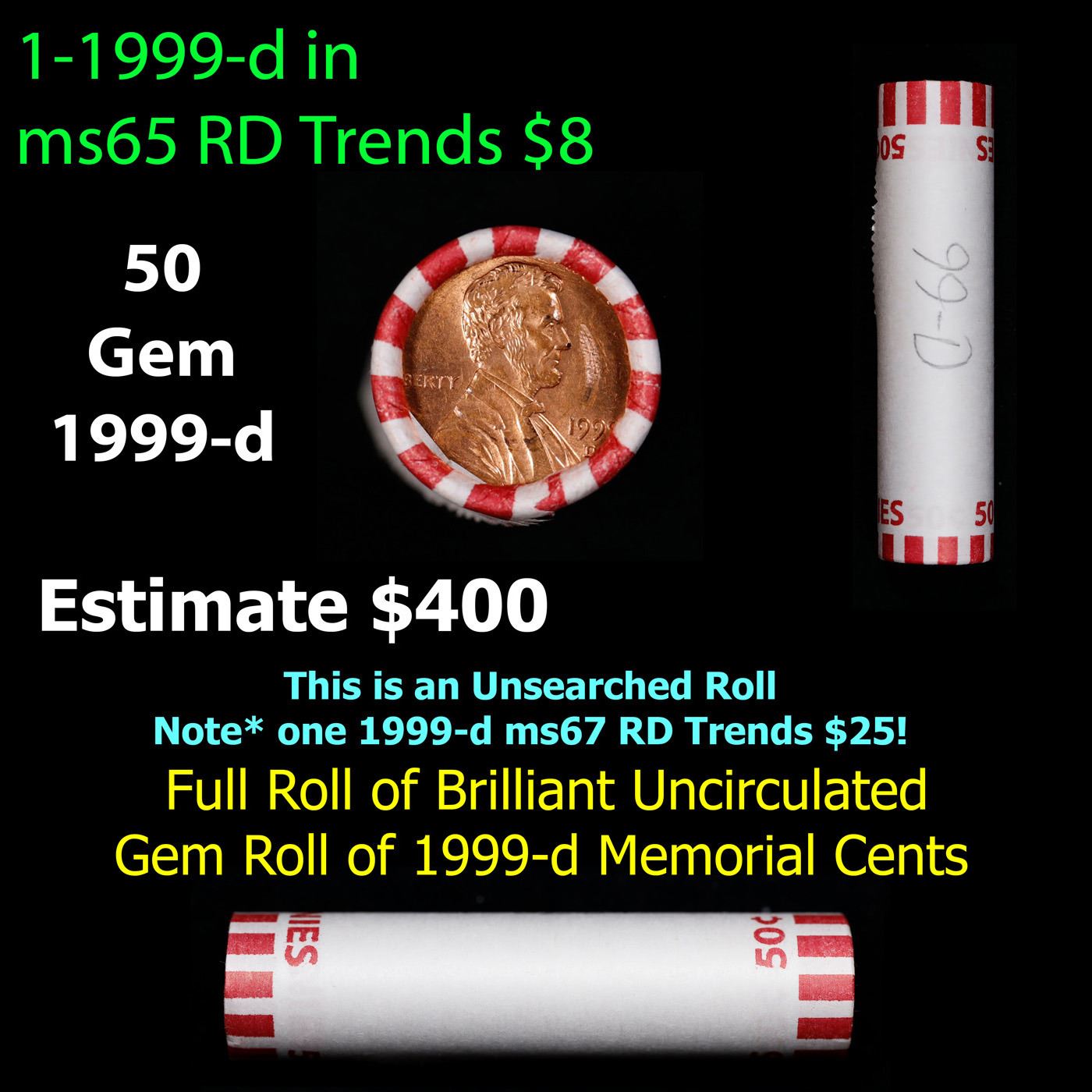 Shotgun Lincoln 1c roll, 1999-d 50 pcs Bank Wrapper.. A terrific Shotgun roll of Lincoln cents. Most if not all coin should be cherry red.