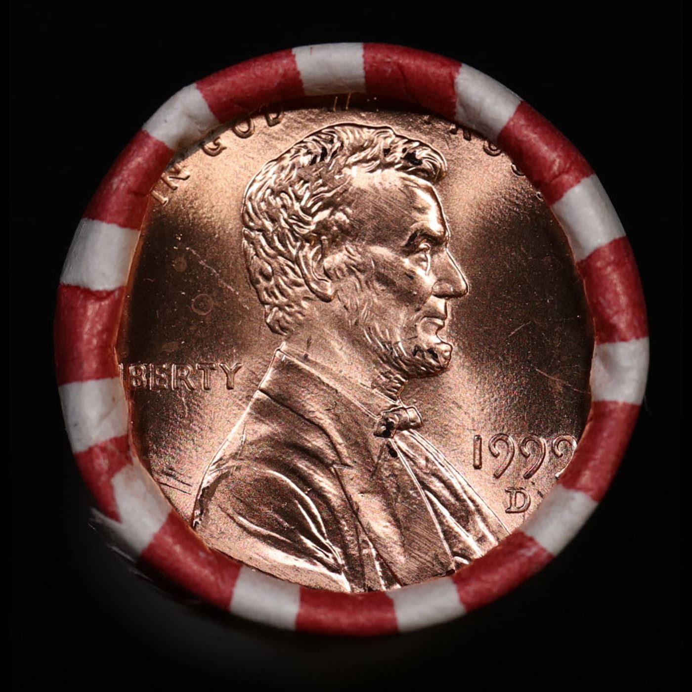 Shotgun Lincoln 1c roll, 1999-d 50 pcs Bank Wrapper.. A terrific Shotgun roll of Lincoln cents. Most if not all coin should be cherry red.