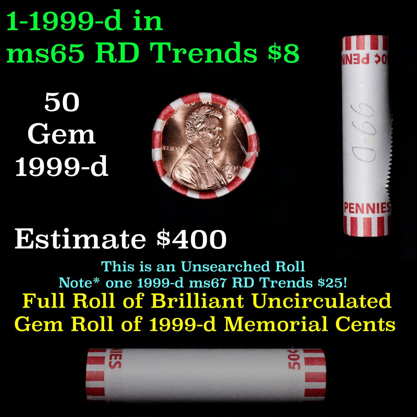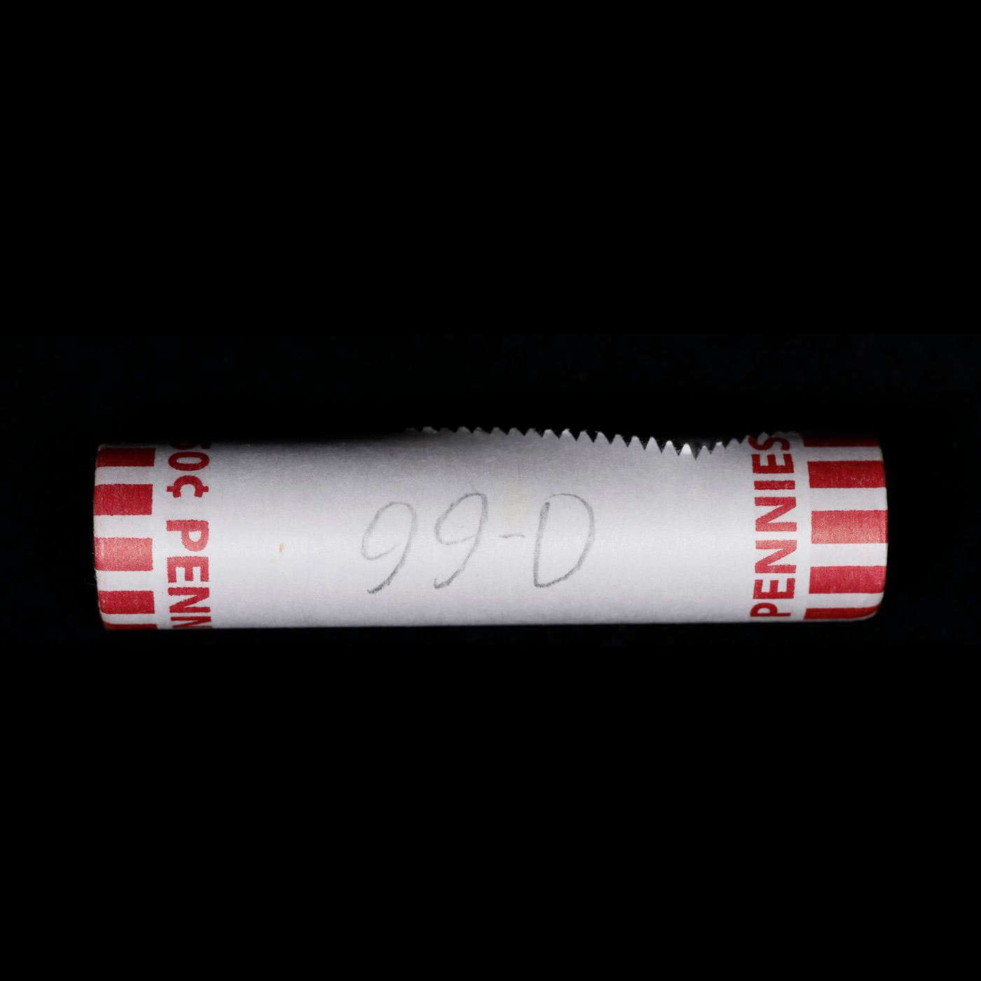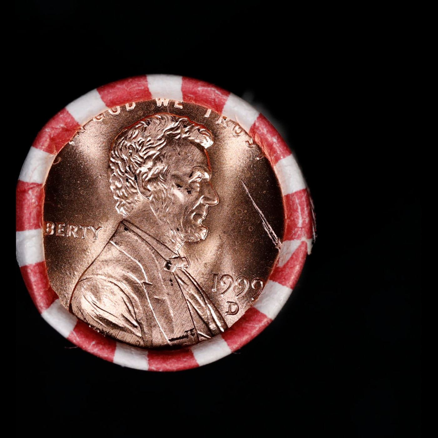 Shotgun Lincoln 1c roll, 1999-d 50 pcs Bank Wrapper.. A terrific Shotgun roll of Lincoln cents. Most if not all coin should be cherry red.