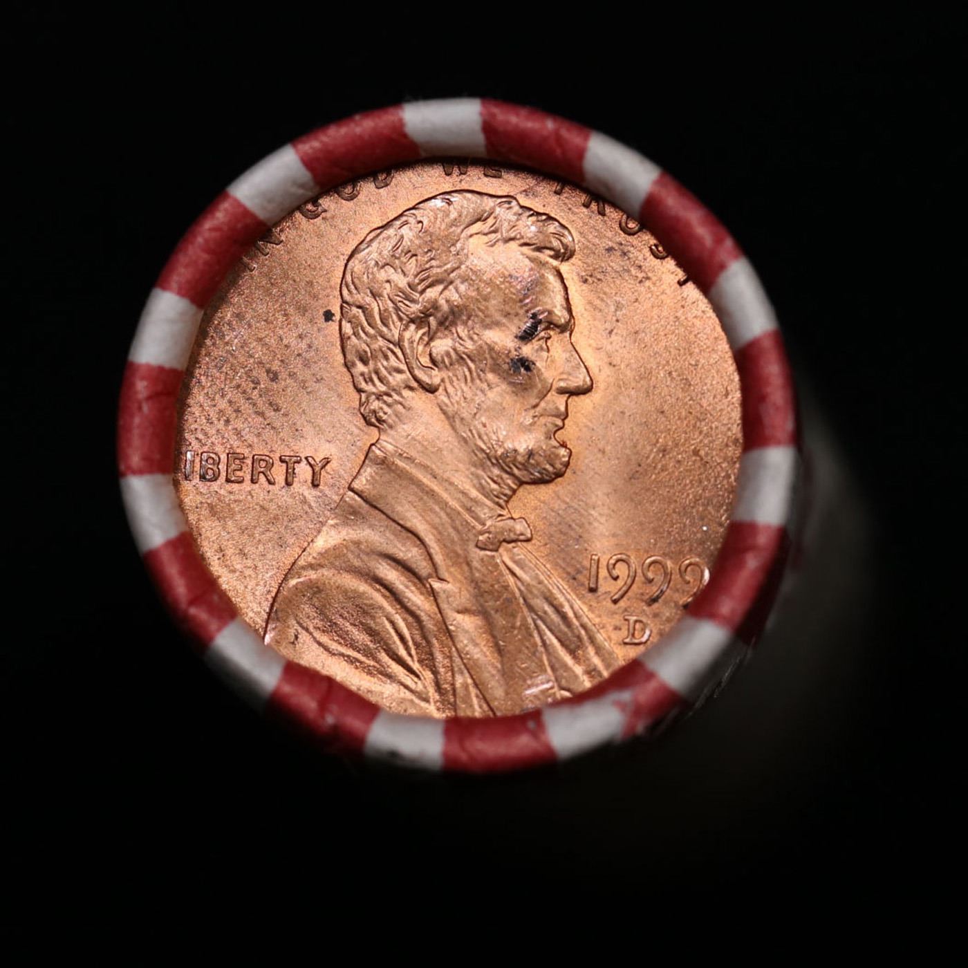 Shotgun Lincoln 1c roll, 1999-d 50 pcs Bank Wrapper.. A terrific Shotgun roll of Lincoln cents. Most if not all coin should be cherry red.