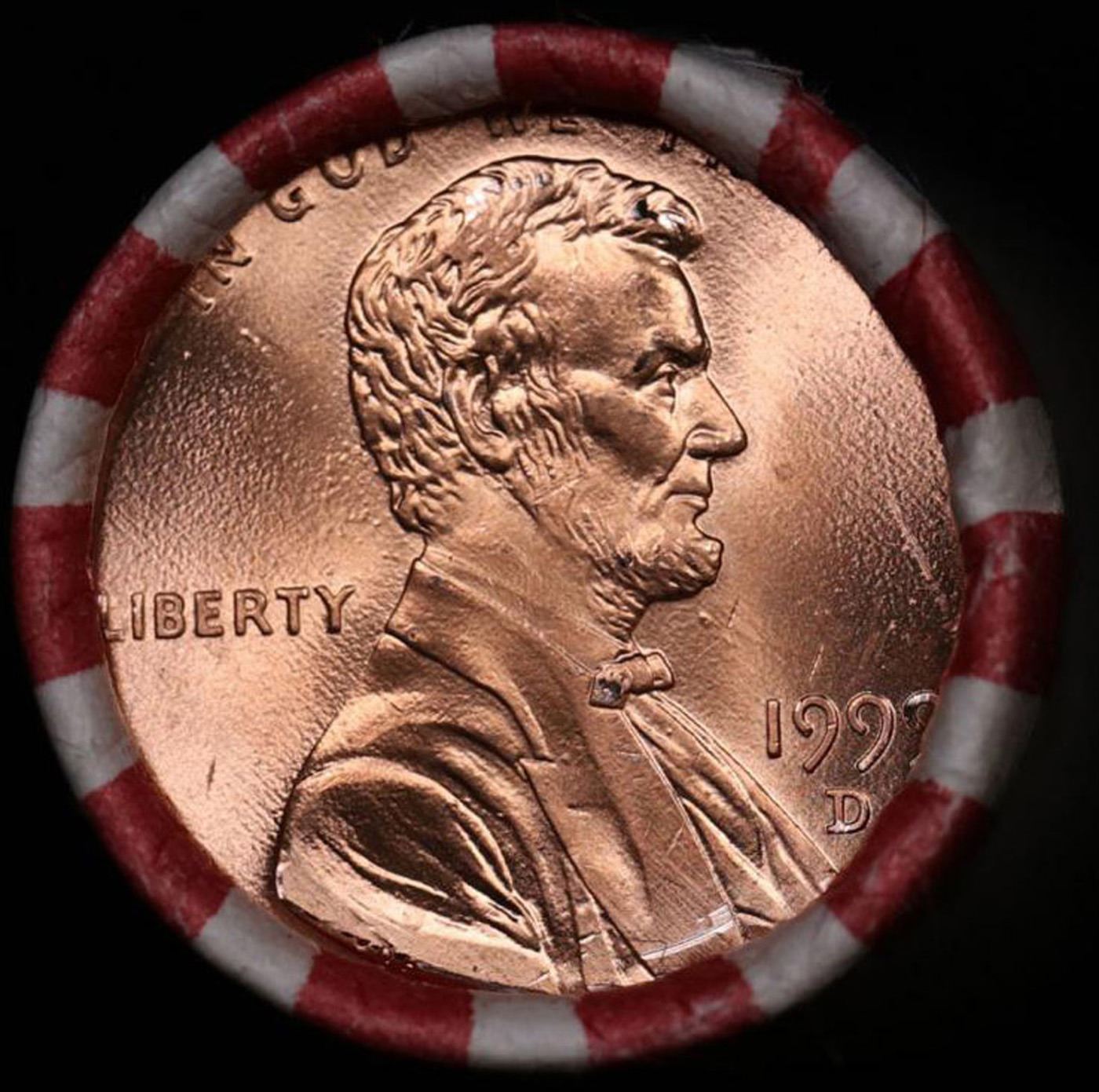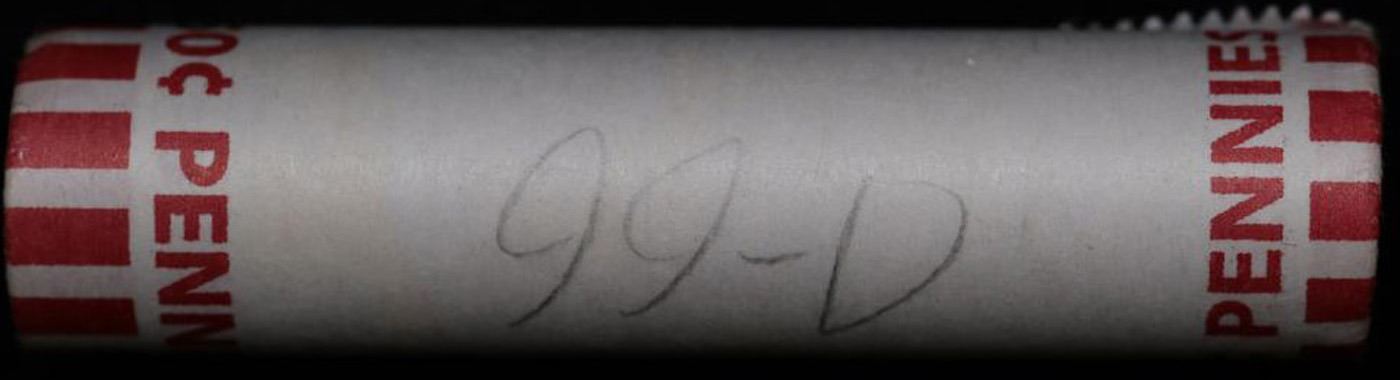 Shotgun Lincoln 1c roll, 1999-d 50 pcs Bank Wrapper.. A terrific Shotgun roll of Lincoln cents. Most if not all coin should be cherry red.