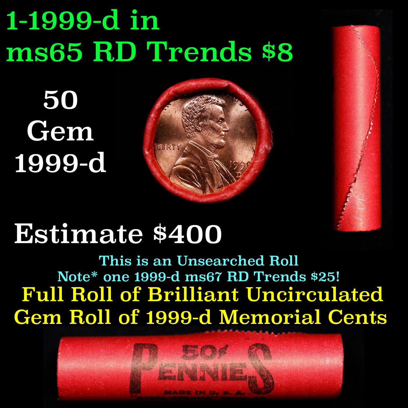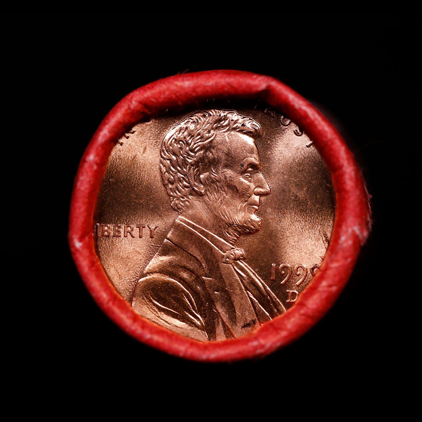 Shotgun Lincoln 1c roll, 1999-d 50 pcs Stell-Strong Wrapper.. A terrific Shotgun roll of Lincoln cents. Most if not all coin should be cherry red.