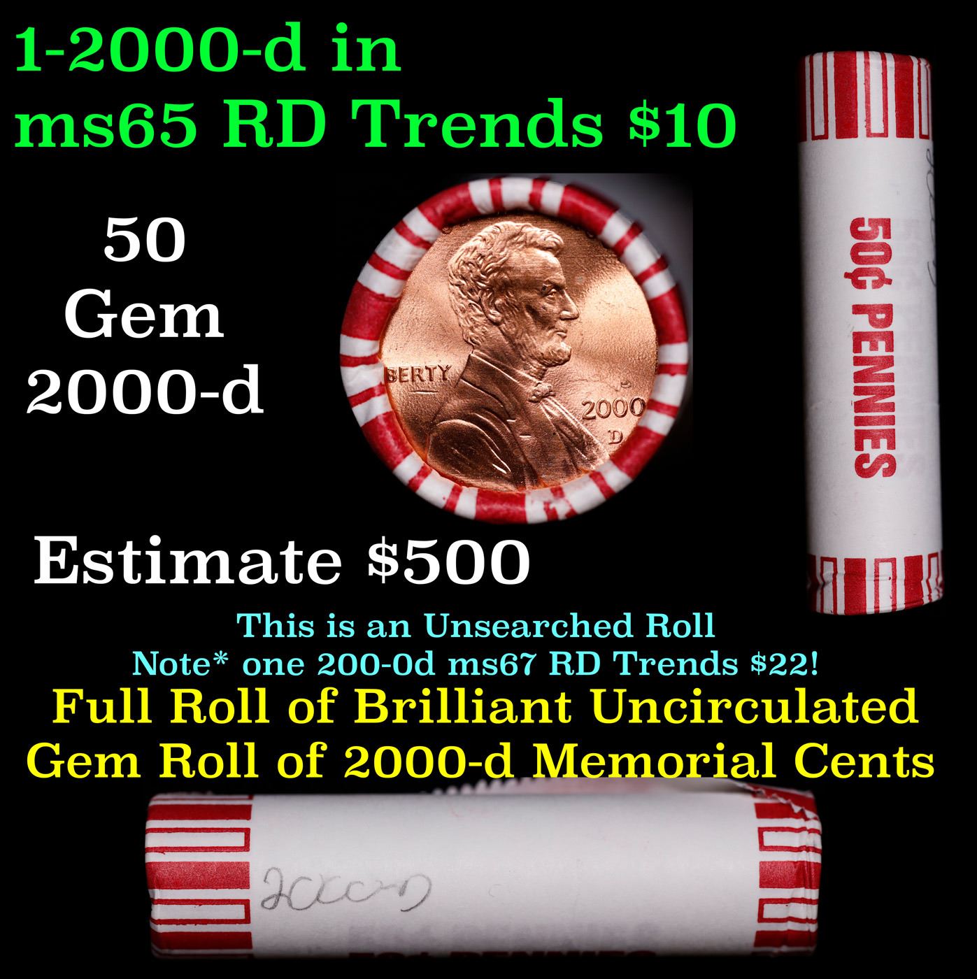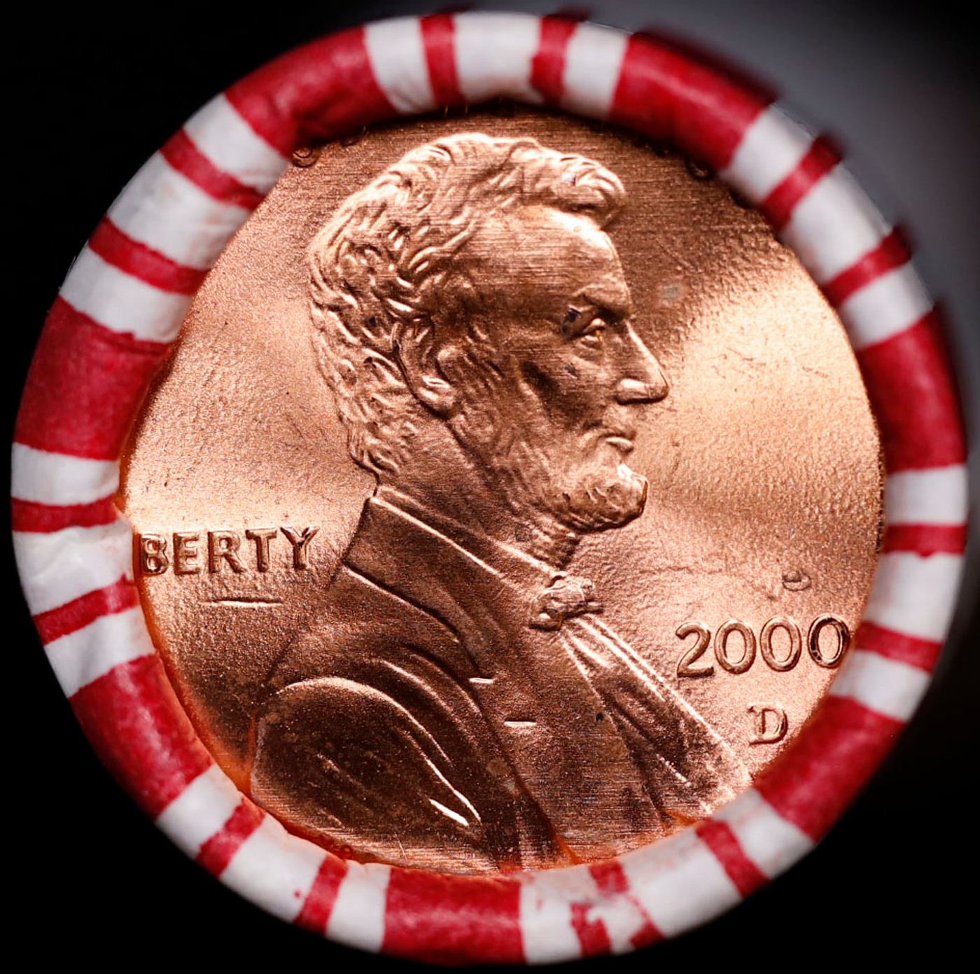 Shotgun Lincoln 1c roll, 2000-d 50 pcs Brandt 50c Wrapper.. A terrific Shotgun roll of Lincoln cents. Most if not all coin should be cherry red.