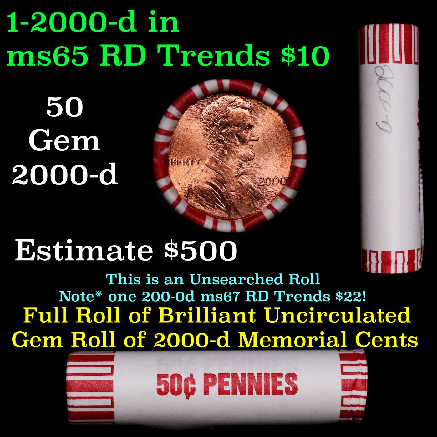 Shotgun Lincoln 1c roll, 2000-d 50 pcs Brandt 50c Wrapper.. A terrific Shotgun roll of Lincoln cents. Most if not all coin should be cherry red.