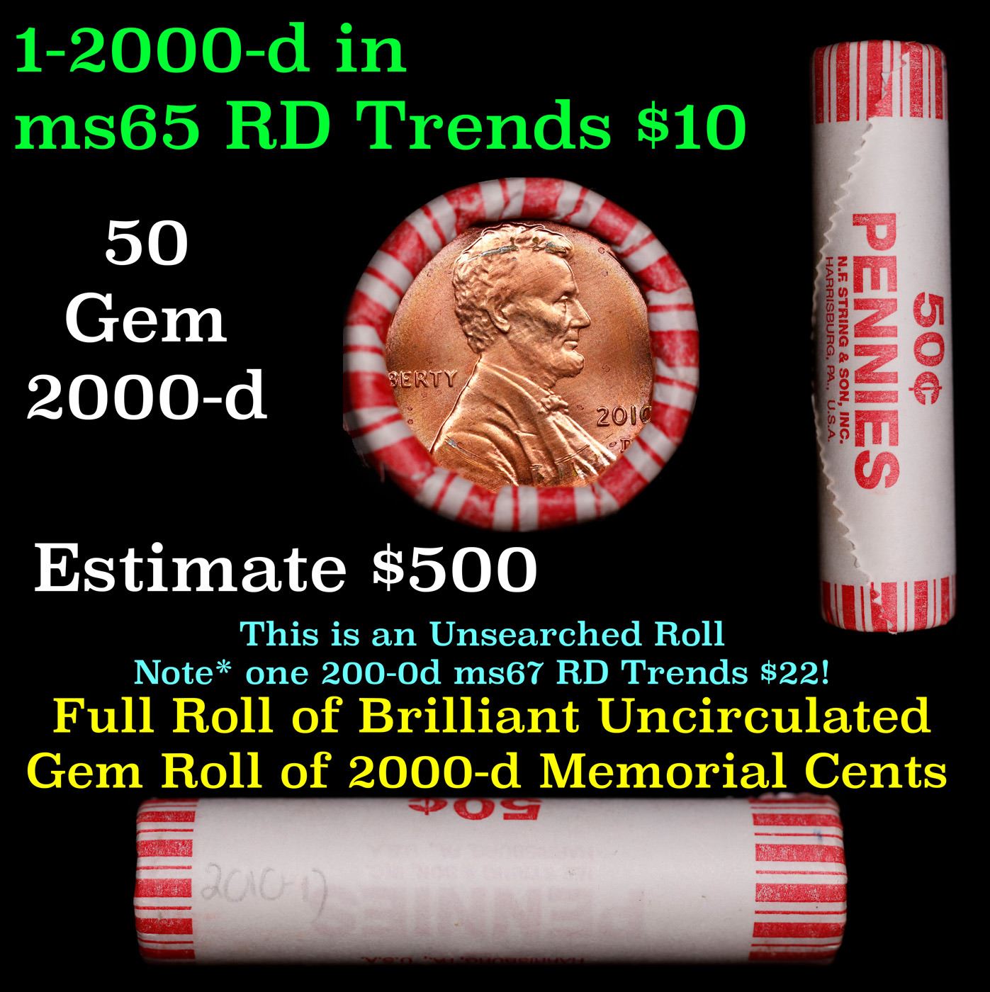 Shotgun Lincoln 1c roll, 2000-d 50 pcs N.F. String & Son Wrapper.. A terrific Shotgun roll of Lincoln cents. Most if not all coin should be cherry red.