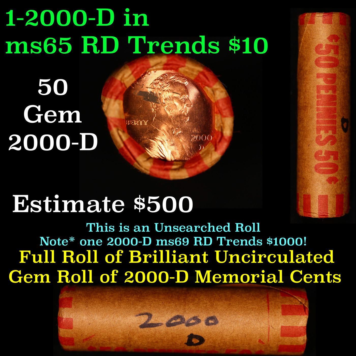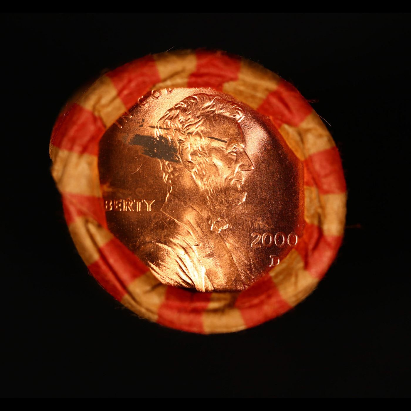 Shotgun Lincoln 1c roll, 2000-d 50 pcs Old Bank Style Wrapper. A terrific Shotgun roll of Lincoln cents. All coins cherry red. Trends ms65 rd $16