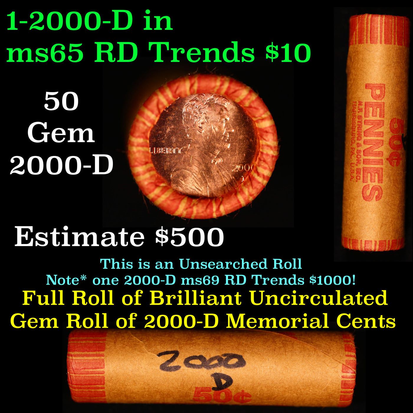 Shotgun Lincoln 1c roll, 2000-d 50 pcs Old Coin Tainer Wrapper . A terrific Shotgun roll of Lincoln cents. All coins cherry red. Trends ms65 rd $16
