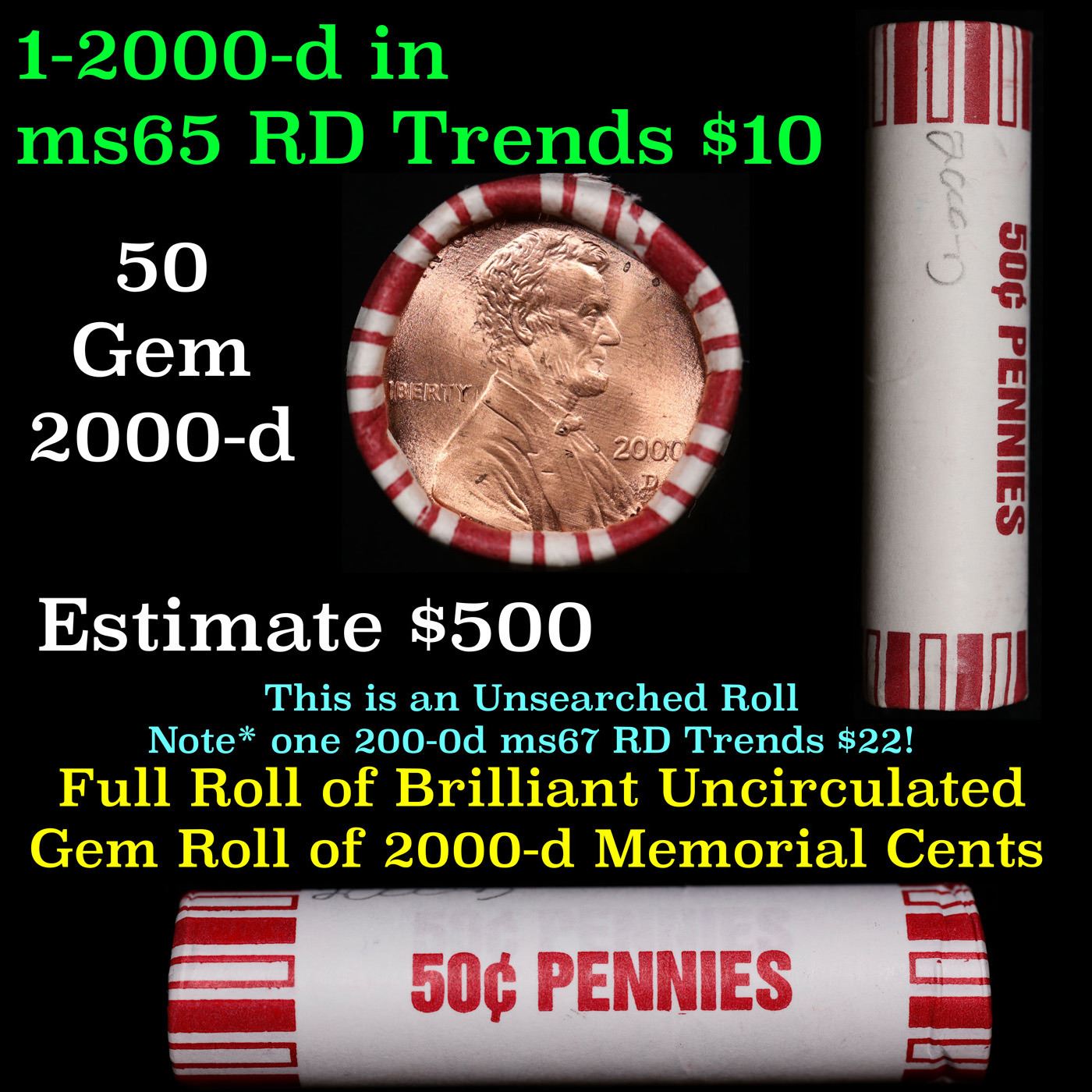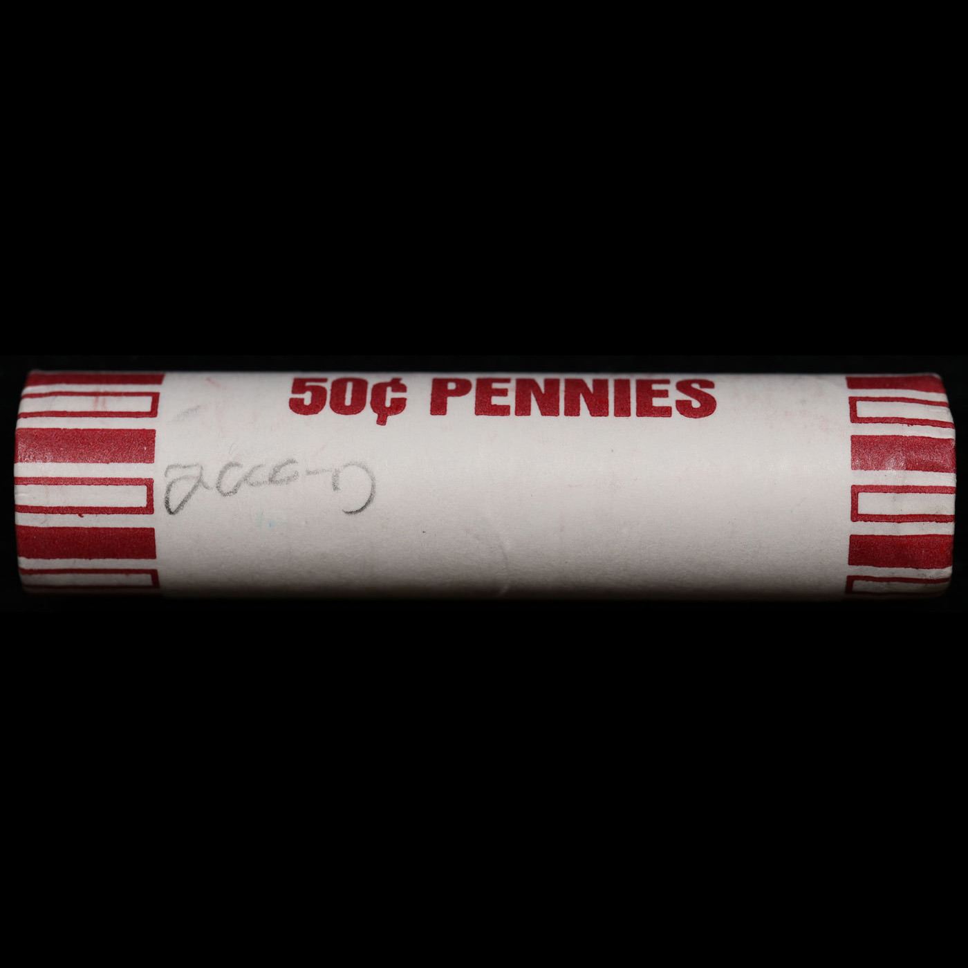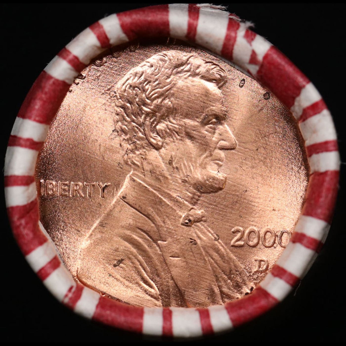 Shotgun Lincoln 1c roll, 2000-d 50 pcs Steel Strong Wrapper.. A terrific Shotgun roll of Lincoln cents. Most if not all coin should be cherry red.