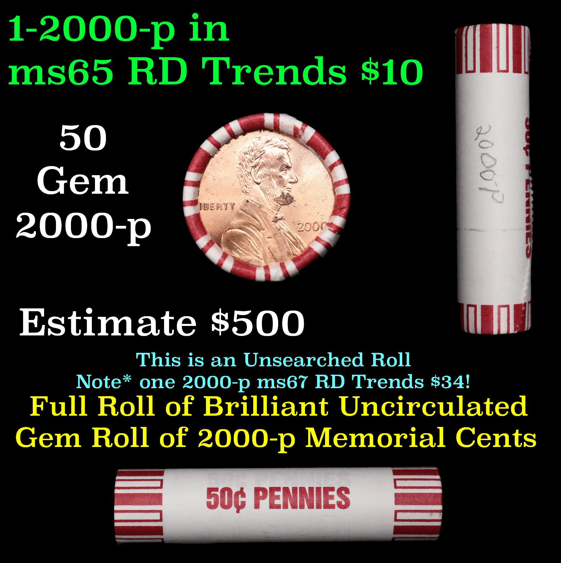 Shotgun Lincoln 1c roll, 2000-p 50 pcs Brandt 50c Wrapper.. A terrific Shotgun roll of Lincoln cents. Most if not all coin should be cherry red.