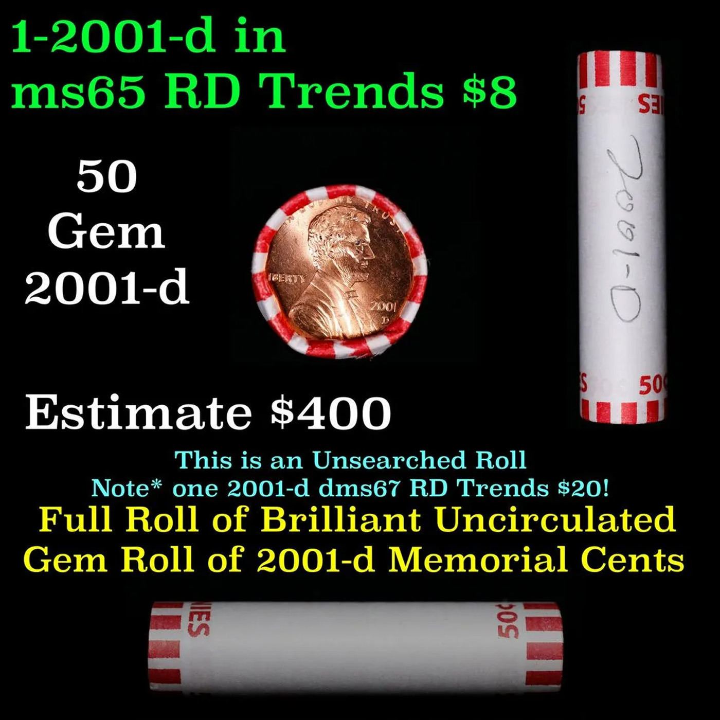 Shotgun Lincoln 1c roll, 2001-d 50 pcs Bank Wrapper.. A terrific Shotgun roll of Lincoln cents. Most if not all coin should be cherry red.
