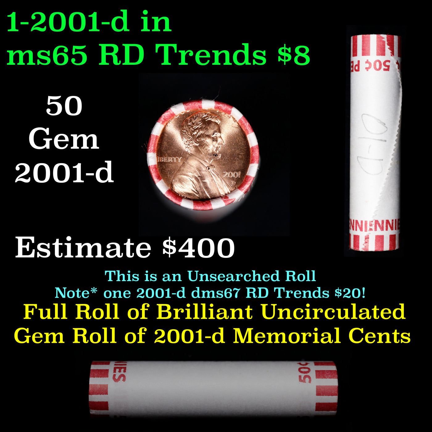 Shotgun Lincoln 1c roll, 2001-d 50 pcs Bank Wrapper.. A terrific Shotgun roll of Lincoln cents. Most if not all coin should be cherry red.