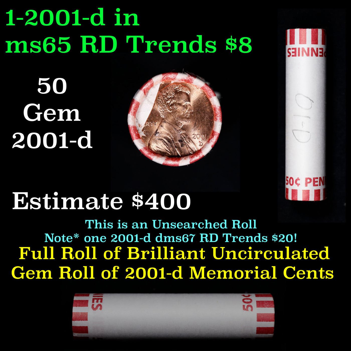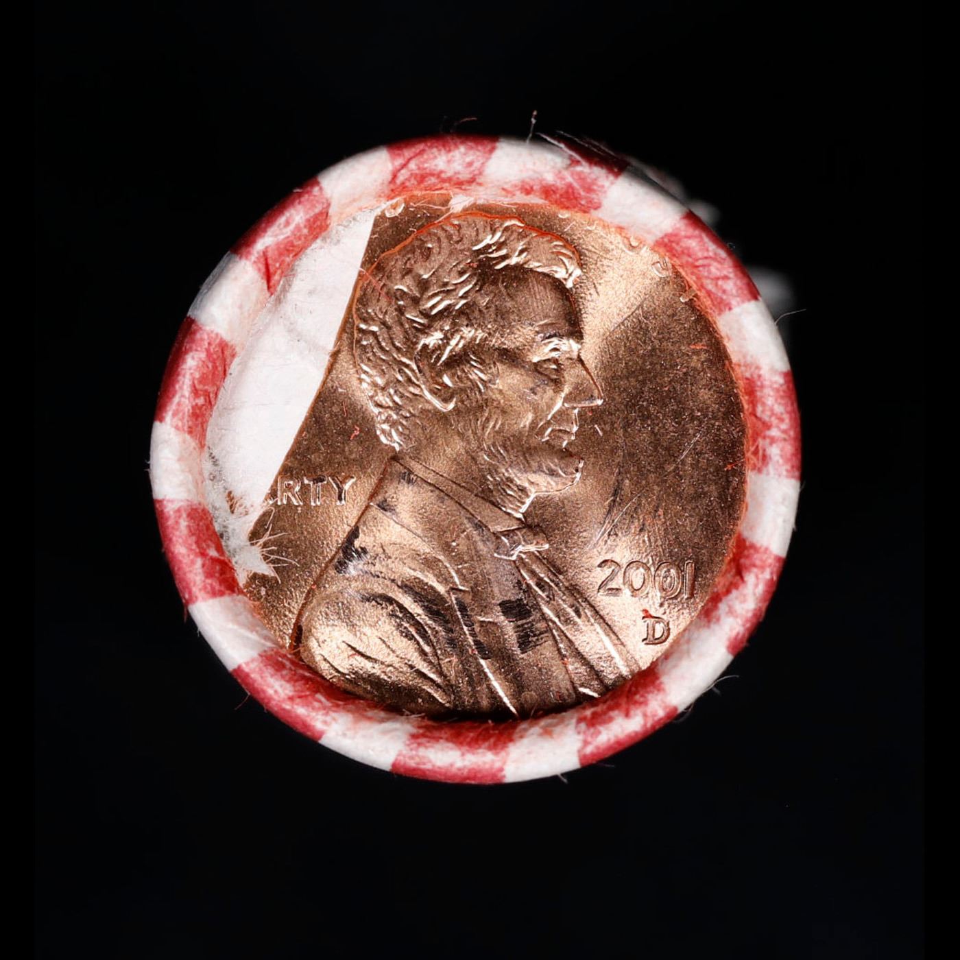 Shotgun Lincoln 1c roll, 2001-d 50 pcs Bank Wrapper.. A terrific Shotgun roll of Lincoln cents. Most if not all coin should be cherry red.