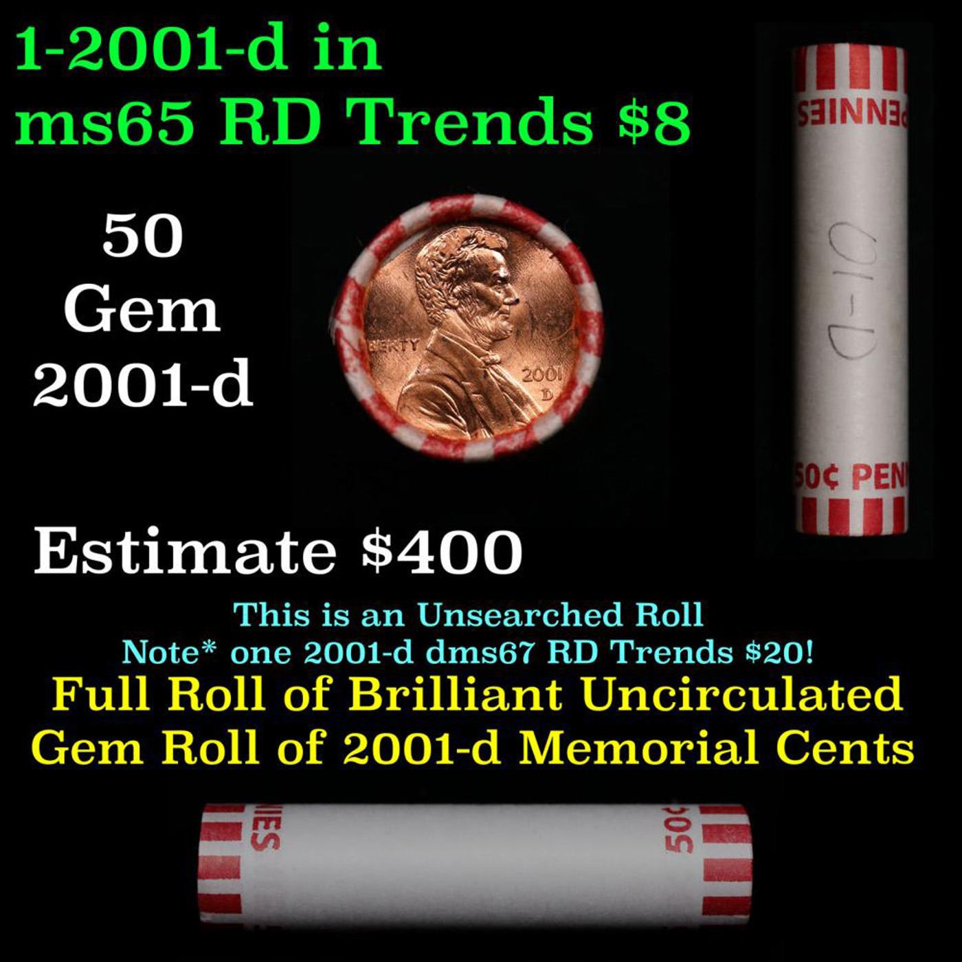 Shotgun Lincoln 1c roll, 2001-d 50 pcs Bank Wrapper.. A terrific Shotgun roll of Lincoln cents. Most if not all coin should be cherry red.