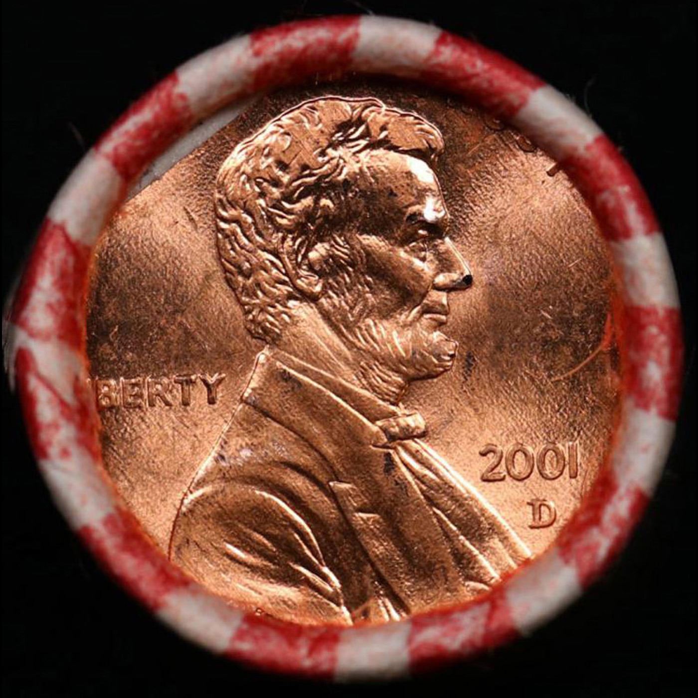 Shotgun Lincoln 1c roll, 2001-d 50 pcs Bank Wrapper.. A terrific Shotgun roll of Lincoln cents. Most if not all coin should be cherry red.