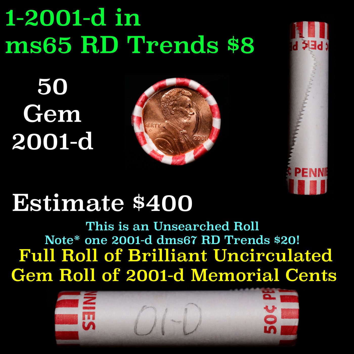Shotgun Lincoln 1c roll, 2001-d 50 pcs Bank Wrapper.. A terrific Shotgun roll of Lincoln cents. Most if not all coin should be cherry red.