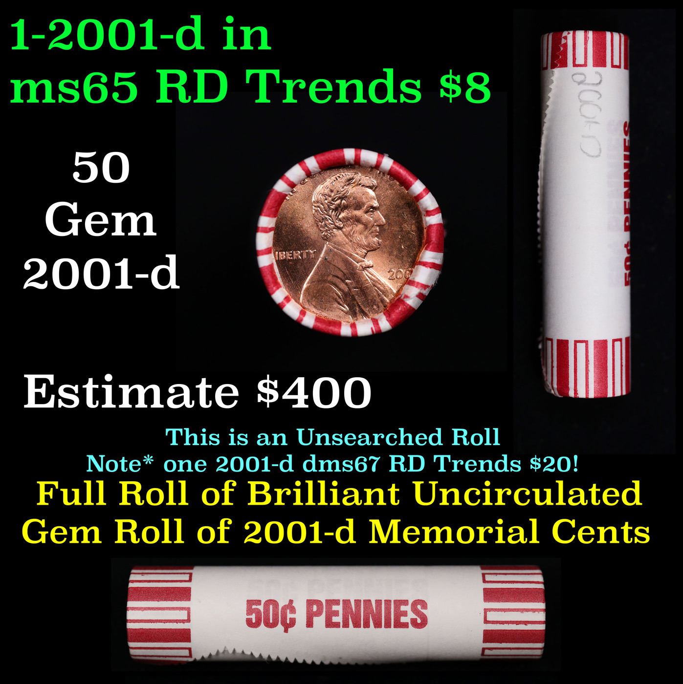 Shotgun Lincoln 1c roll, 2001-d 50 pcs Bank Wrapper.. A terrific Shotgun roll of Lincoln cents. Most if not all coin should be cherry red.