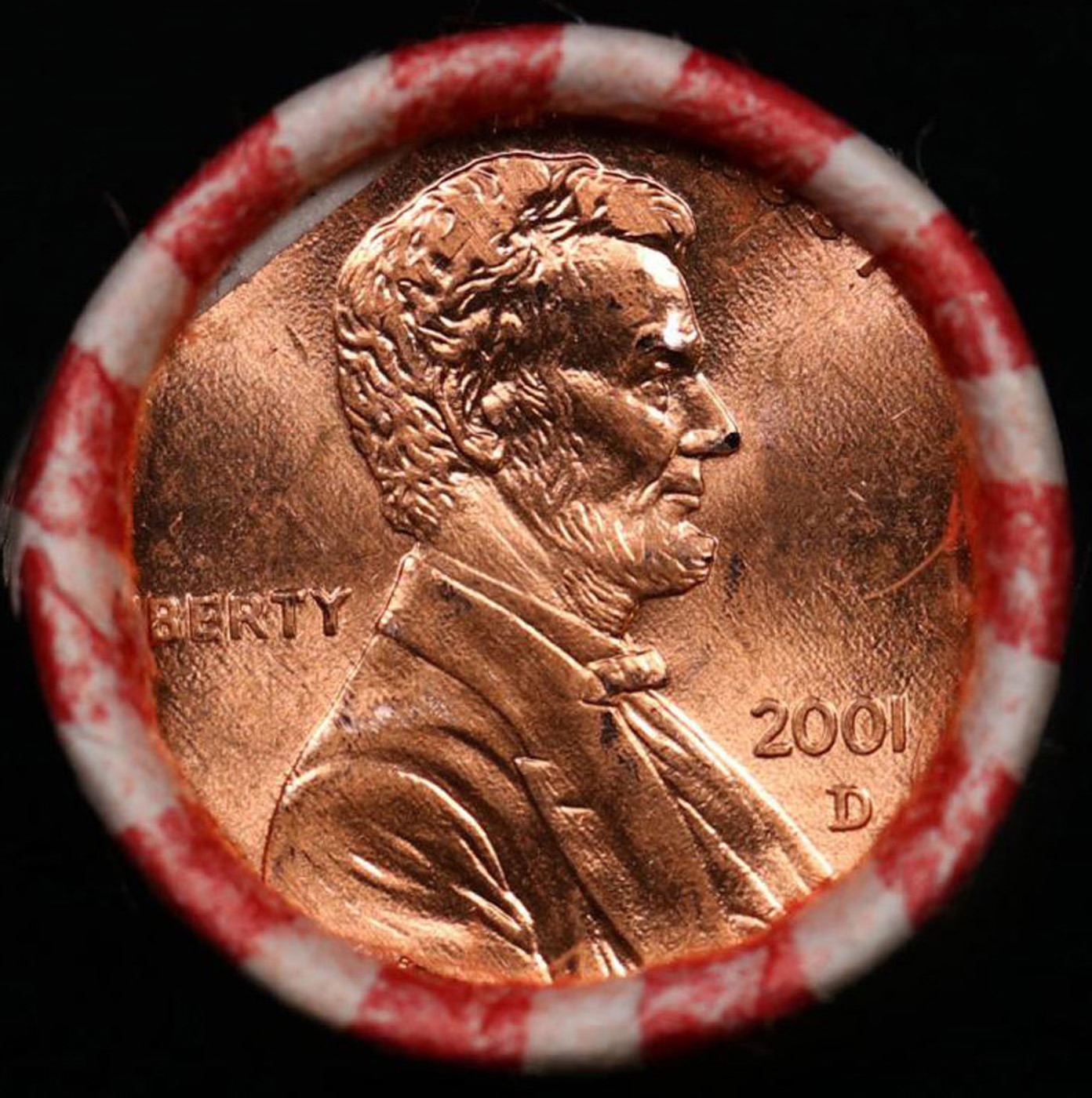 Shotgun Lincoln 1c roll, 2001-d 50 pcs Bank Wrapper.. A terrific Shotgun roll of Lincoln cents. Most if not all coin should be cherry red.