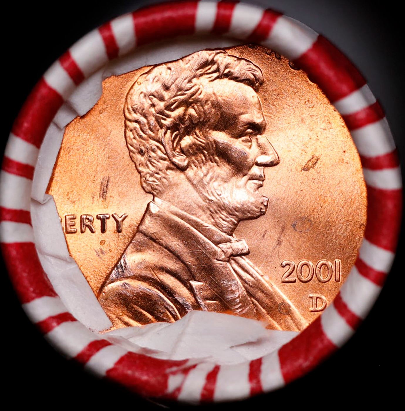 Shotgun Lincoln 1c roll, 2001-d 50 pcs Bank Wrapper.. A terrific Shotgun roll of Lincoln cents. Most if not all coin should be cherry red.