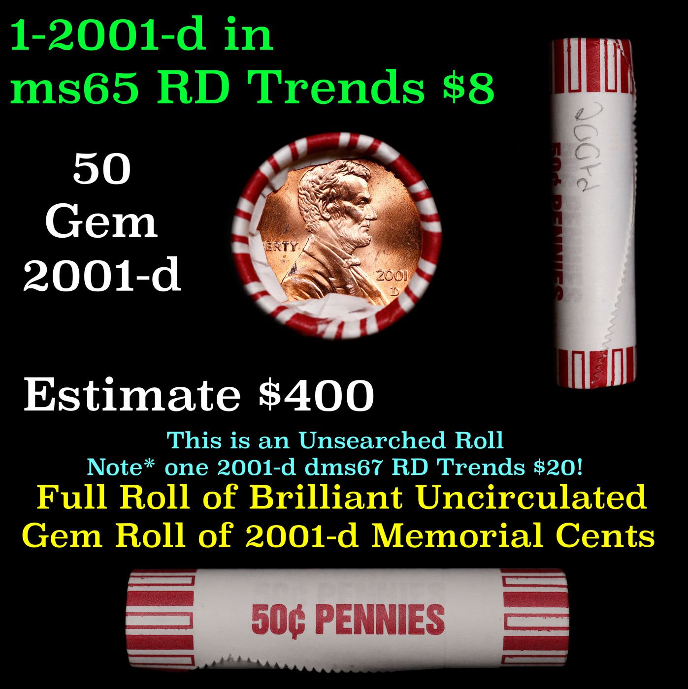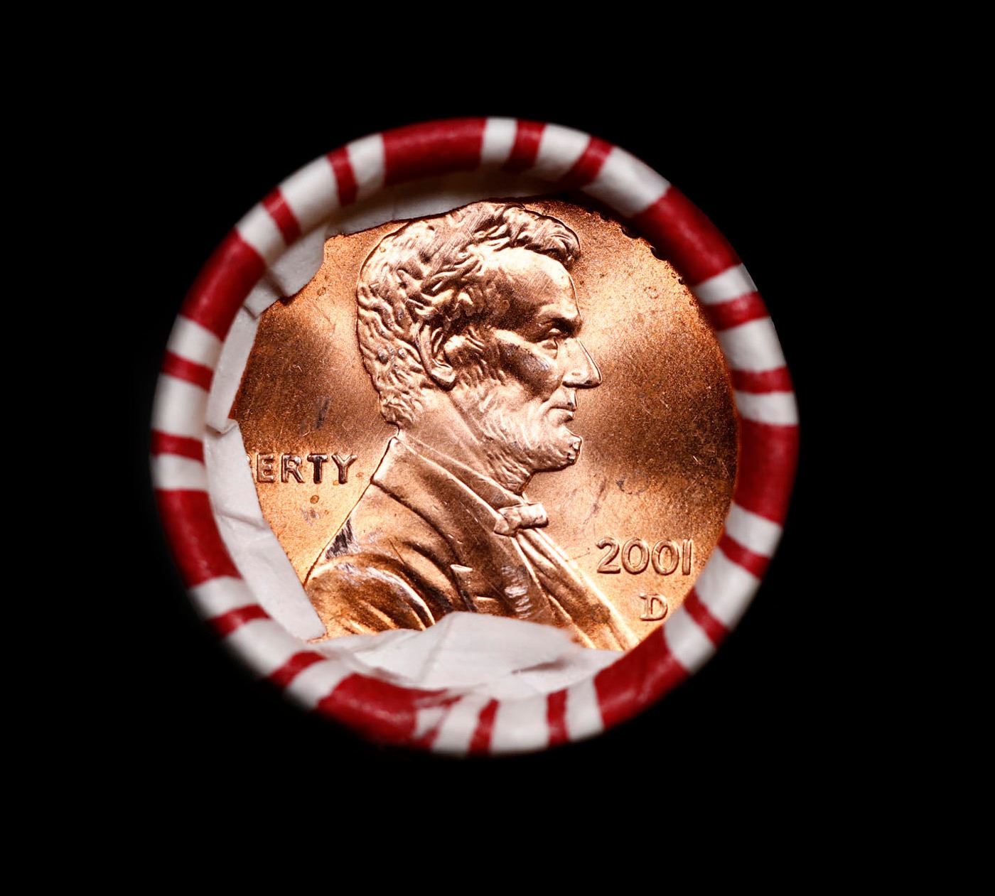 Shotgun Lincoln 1c roll, 2001-d 50 pcs Brandt 50c Wrapper.. A terrific Shotgun roll of Lincoln cents. Most if not all coin should be cherry red.